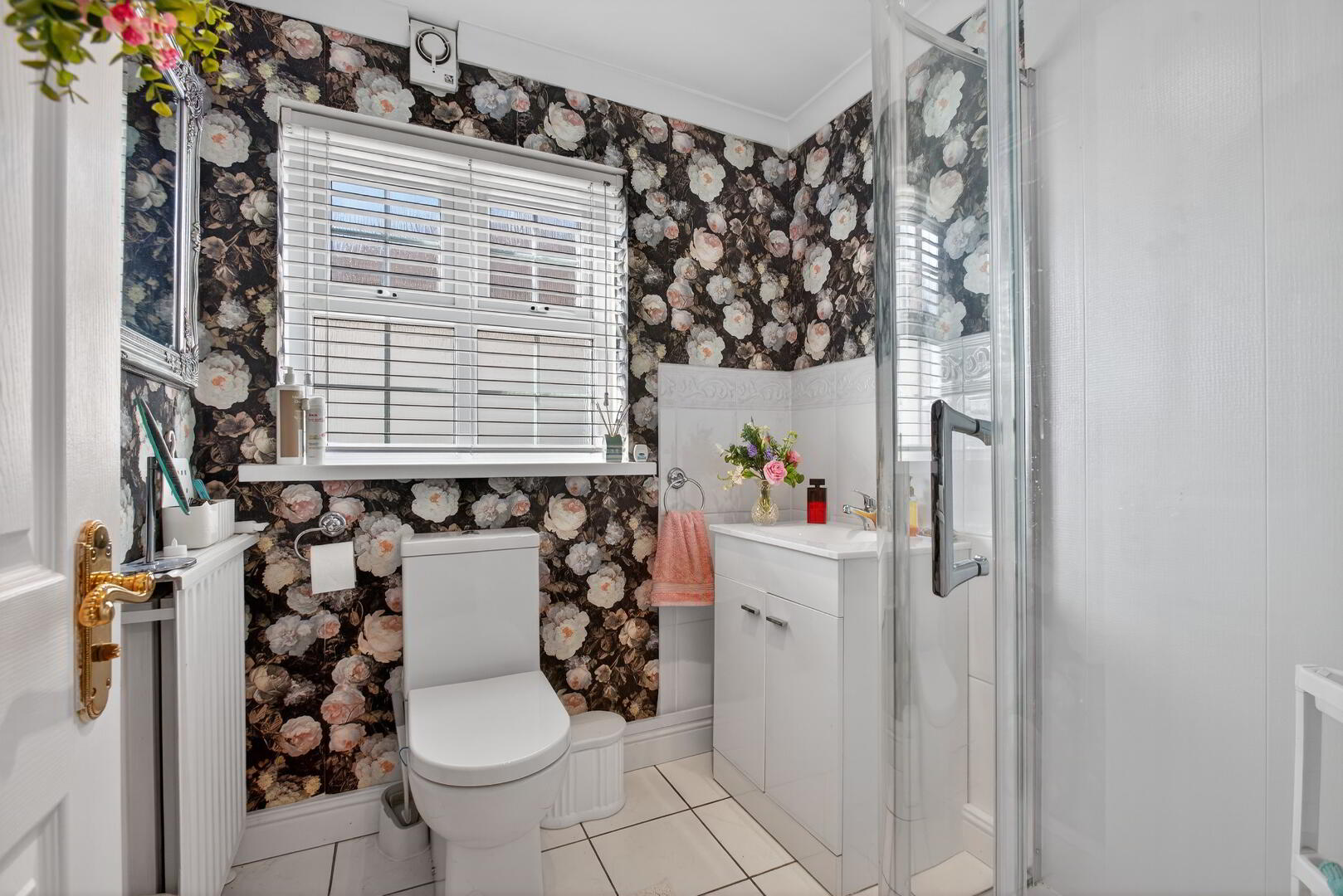 Low flush wc, wash hand basin with mixer tap set on vanity unit, quadrant shower cubicle with Mira Sport electric shower, radiator, uPVC double glazed window to side, tiled flooring, part tiled walls, coved ceiling