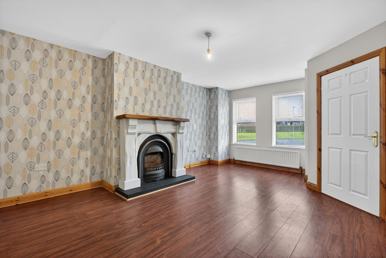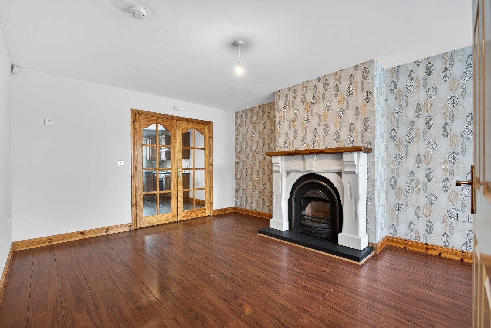 uPVC double glazed windows to front, radiator, laminated wooden flooring, cast iron fireplace with tiled hearth, painted surround, glazed French doors into kitchen/diner