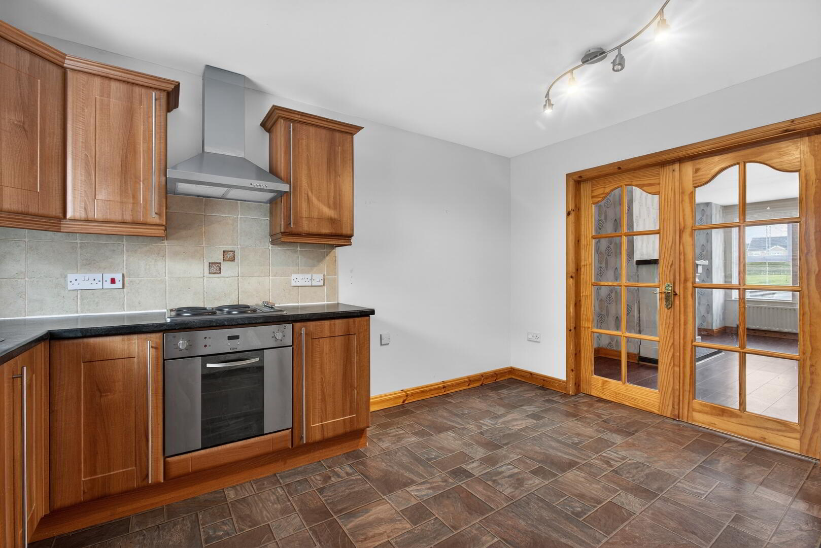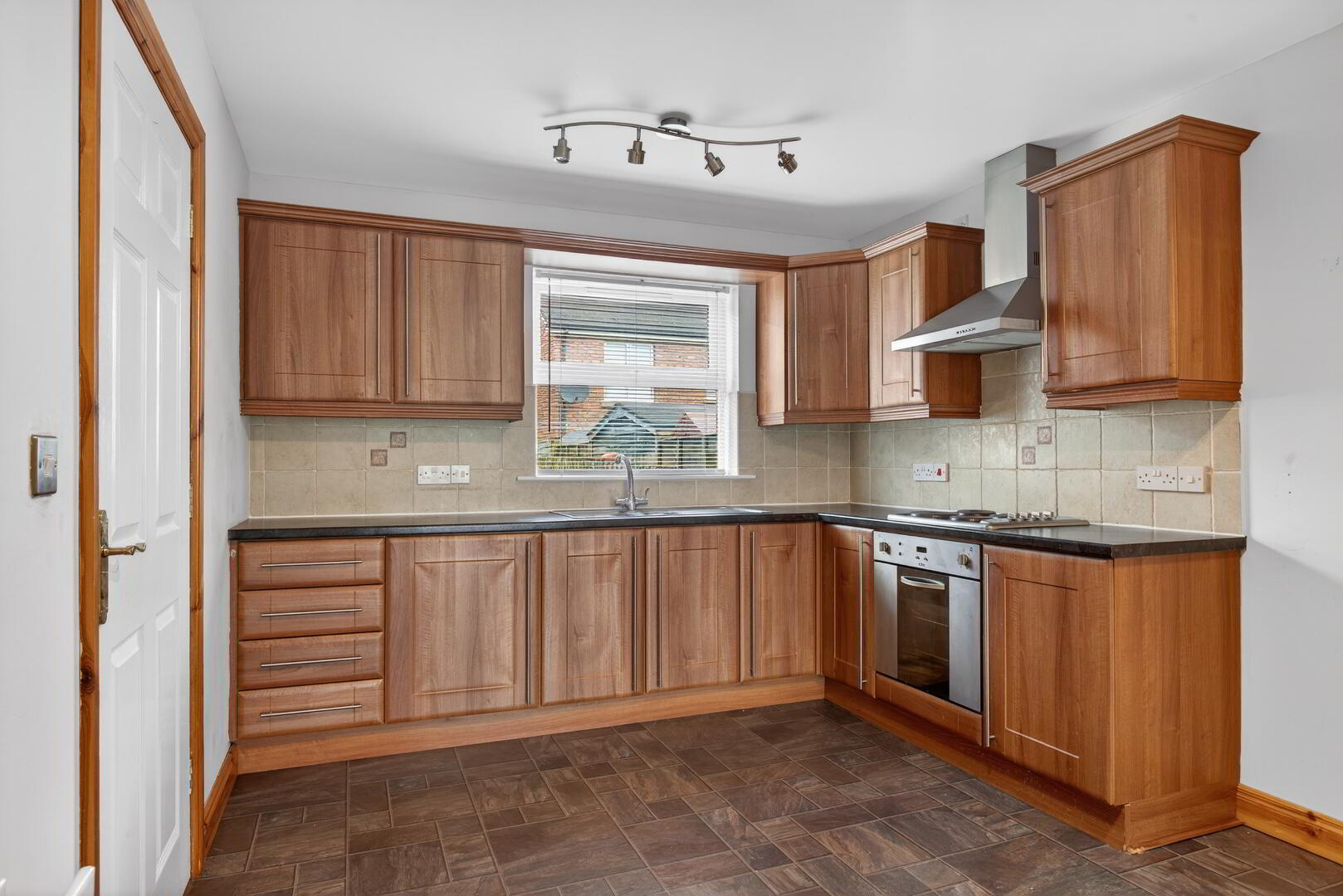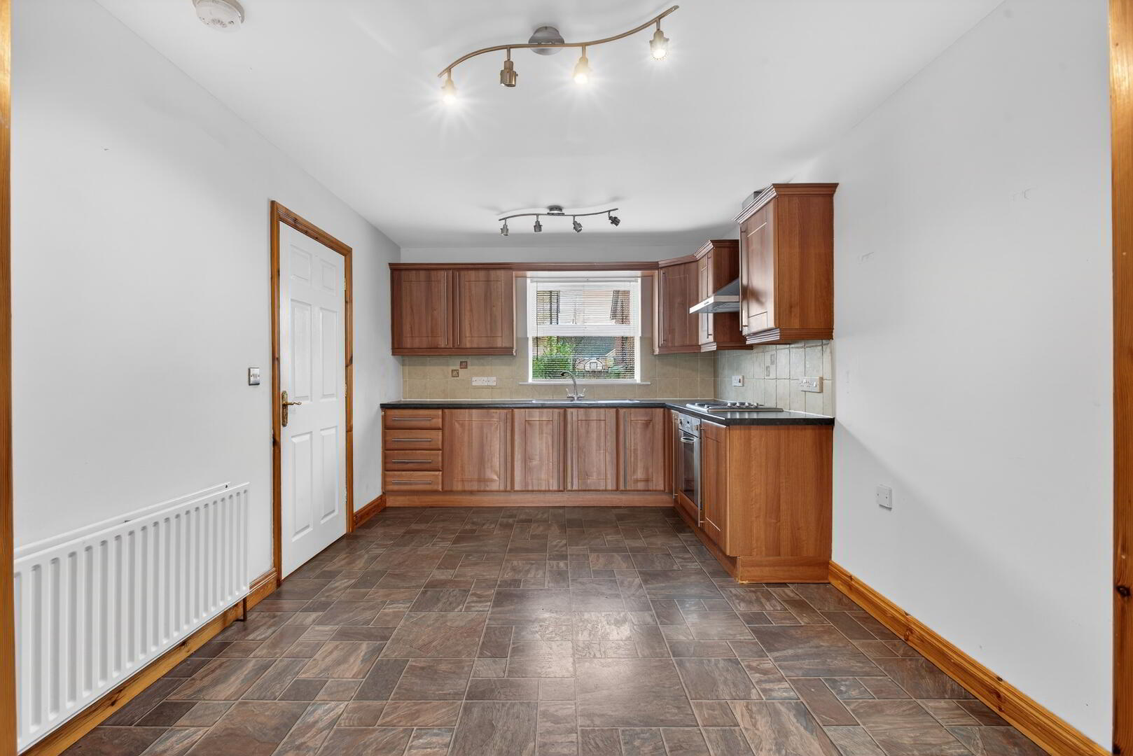 Range of walnut shaker eye and low level units, 1 1/4 sink with mixer tap, electric oven, hob and extractor hood, part tiled walls, radiator, uPVC double glazed window to rear, door into utility room