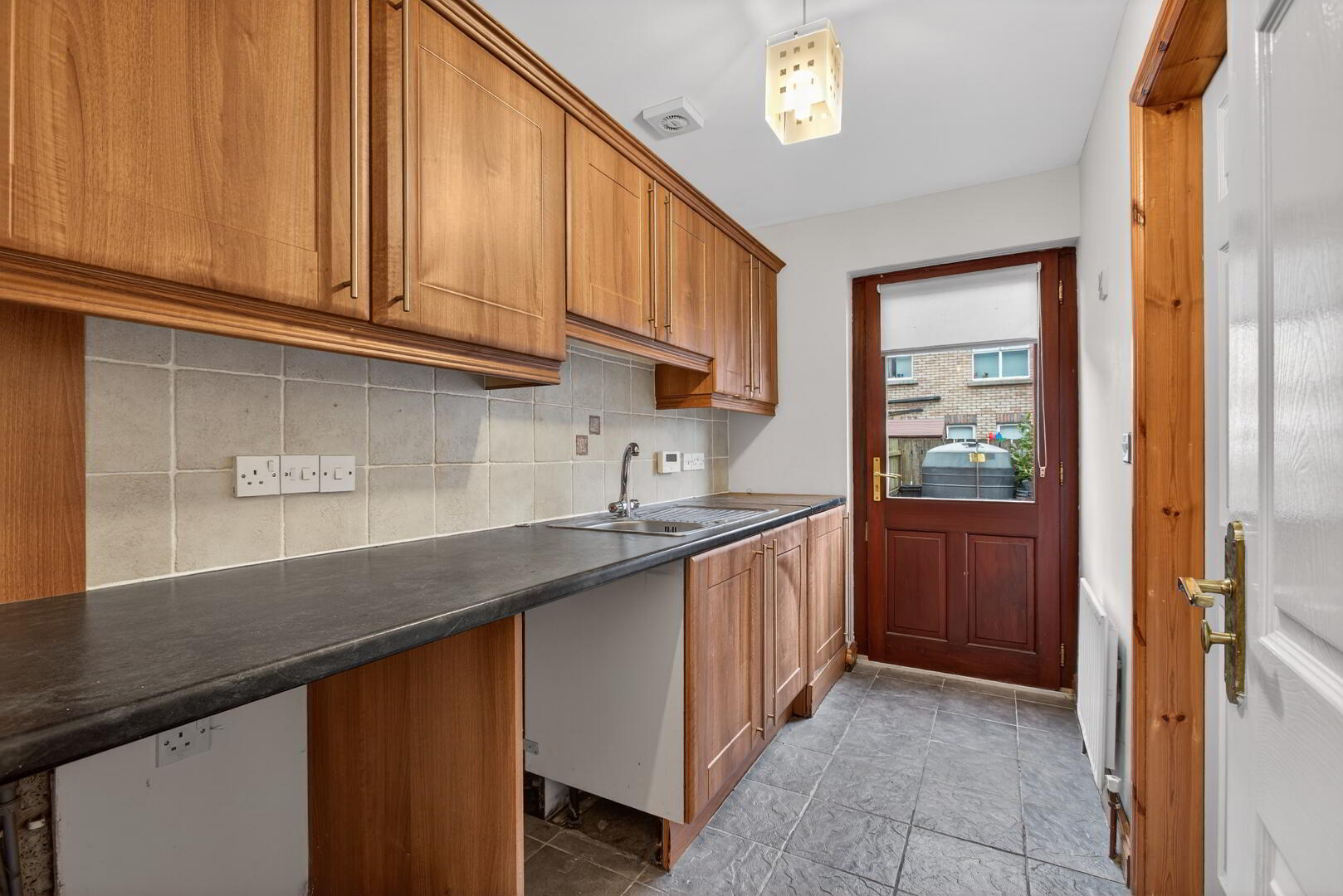 Range of walnut shaker eye and low level units, stainless steel sink with mixer tap, plumbed for washing machine, space for tumble dryer, oil boiler, tiled floor and part tiled walls, radiator, hardwood double glazed door to rear, door to ground floor wc