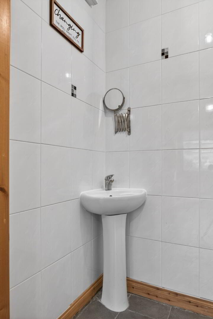 Low flush wc, pedestal wash hand basin, tiled walls and floor