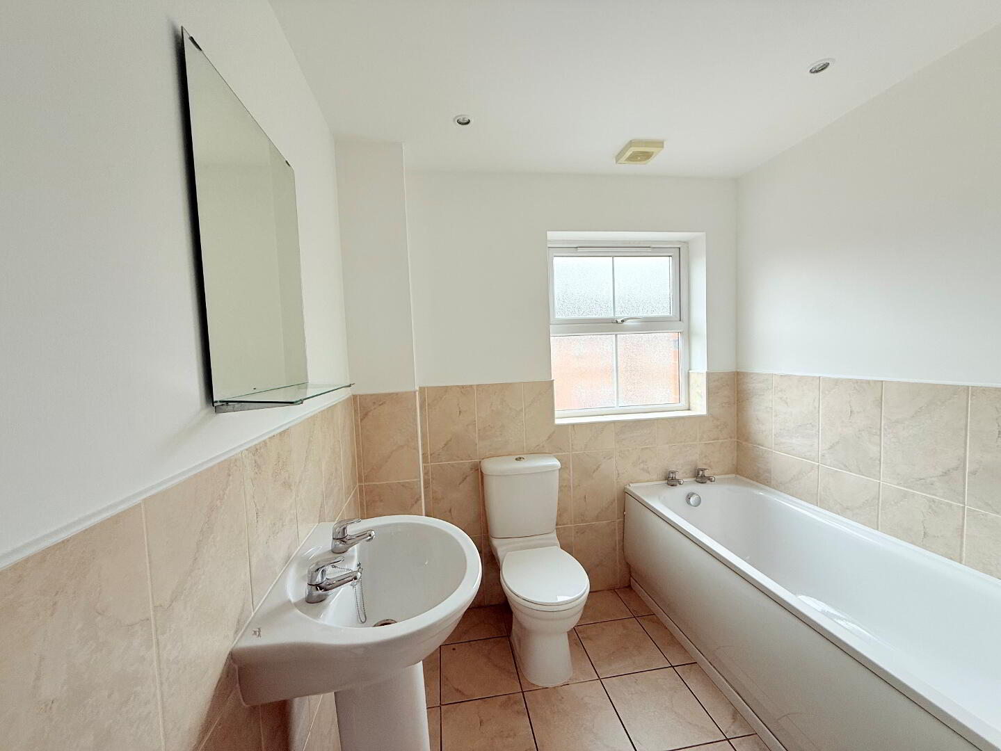 Bath, pedestal wash hand basin, low flush wc, part tiled walls, tiled flooring, radiator, built in hot press, uPVC double glazed window to front, recessed ceiling lights