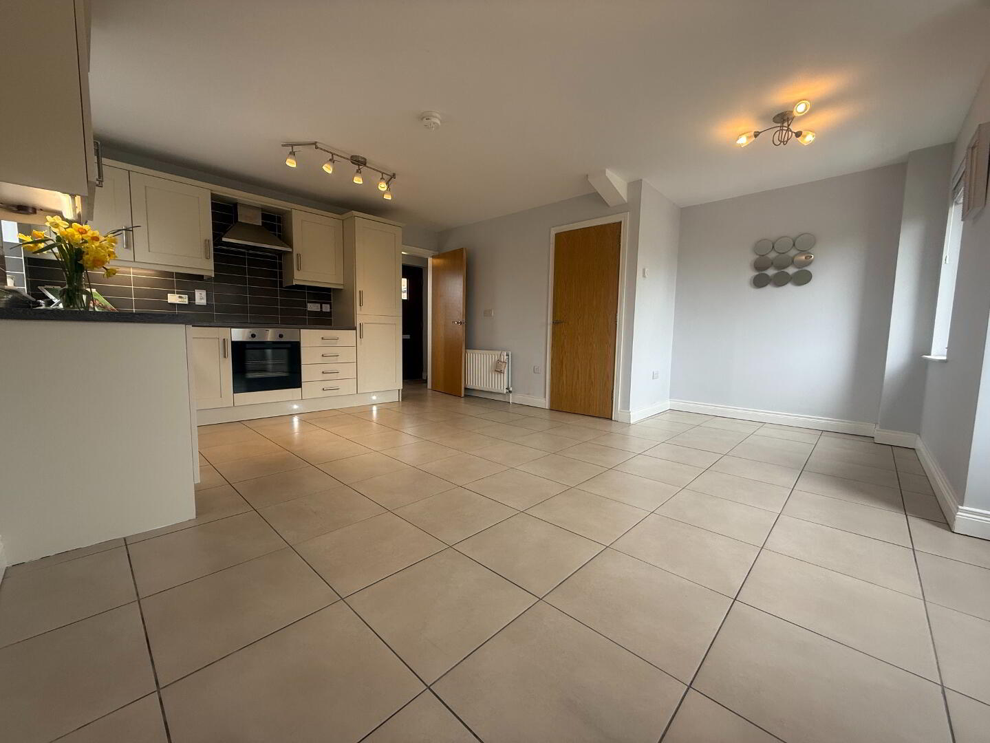 Inside, the apartment features a luxury fitted kitchen with a range of integrated appliances, including a fridge freezer, ceramic hob, and electric oven, complemented by stylish under-unit and floor-level mood lighting. The spacious lounge with dining area provides an ideal setting for both relaxation and entertaining.