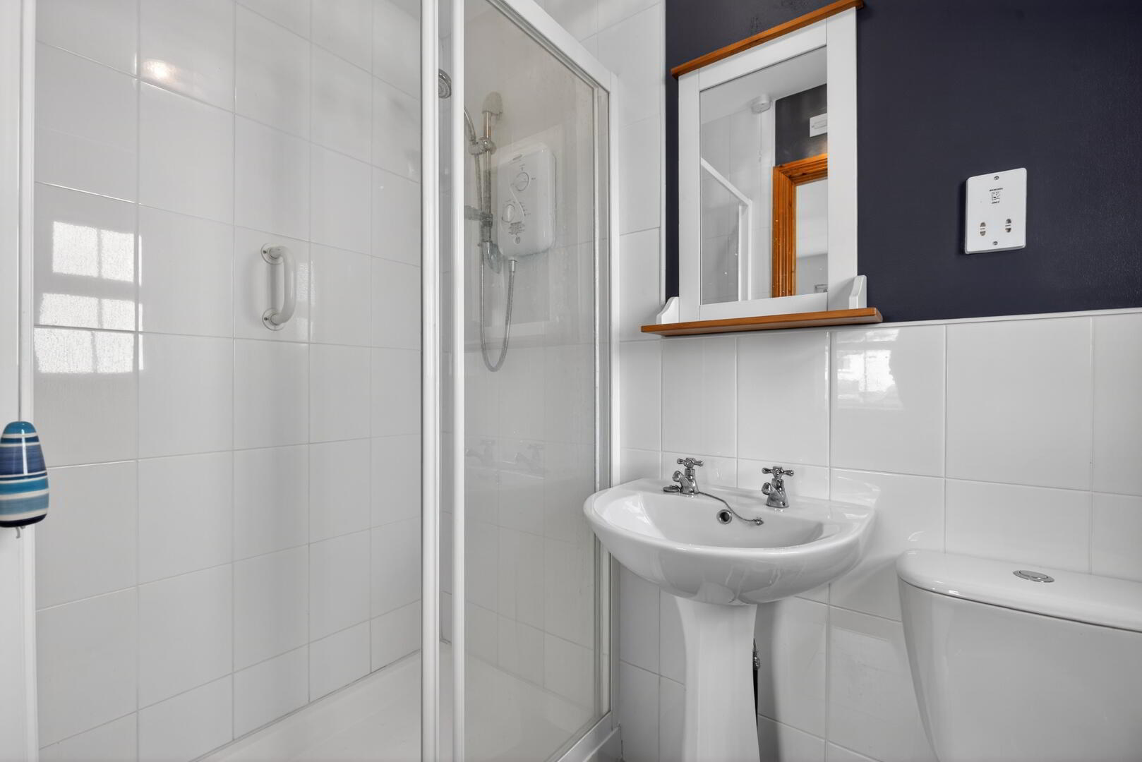 Step in shower cubicle with electric shower, pedestal wash hand basin, low flush wc, part tiled walls, tiled flooring, radiator, uPVC double glazed window to side