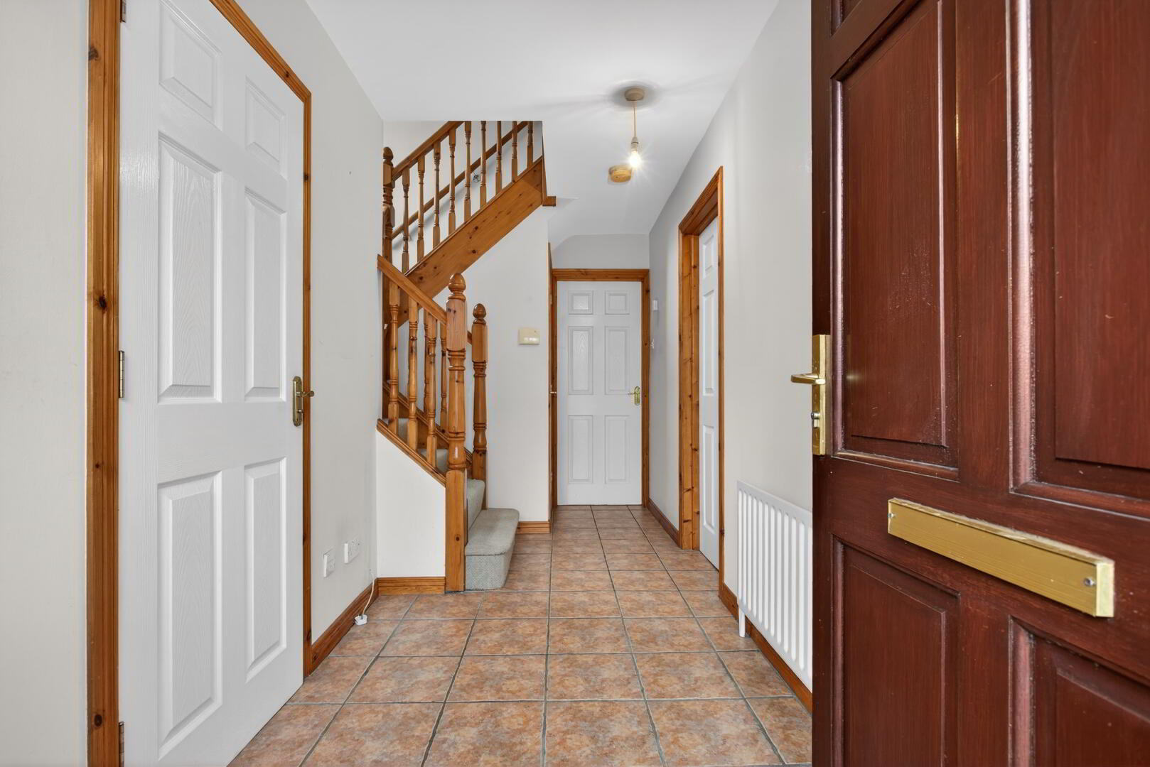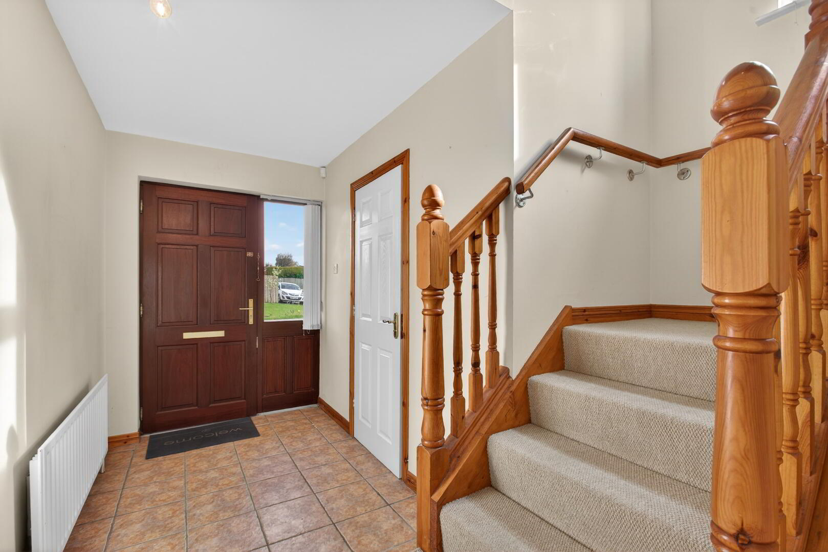 Hardwood door to front, double glazed side window, radiator, tiled floor, understairs cupboard