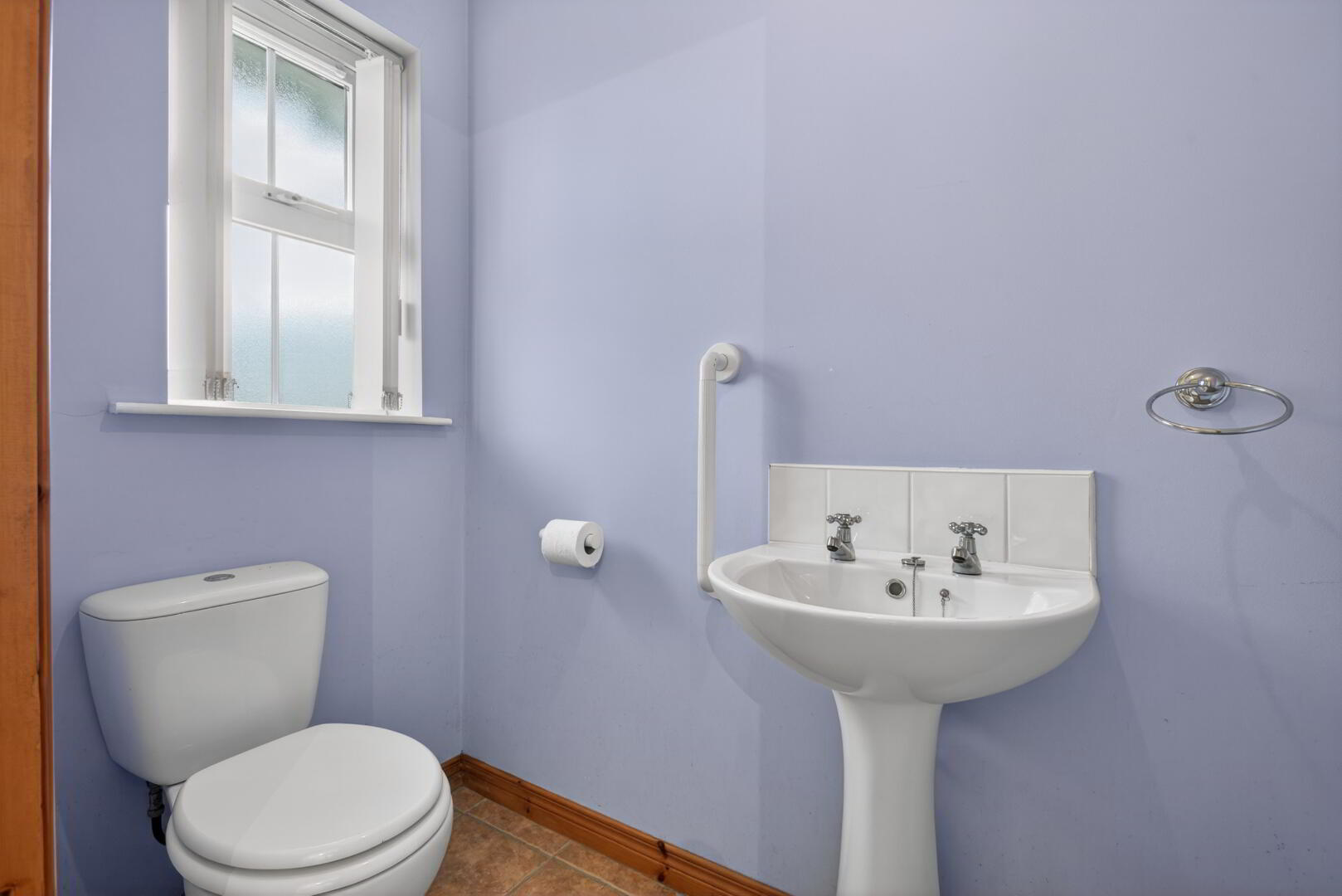 Low flush wc, pedestal wash hand basin, tiled splashback, tiled flooring, uPVC double glazed window to front