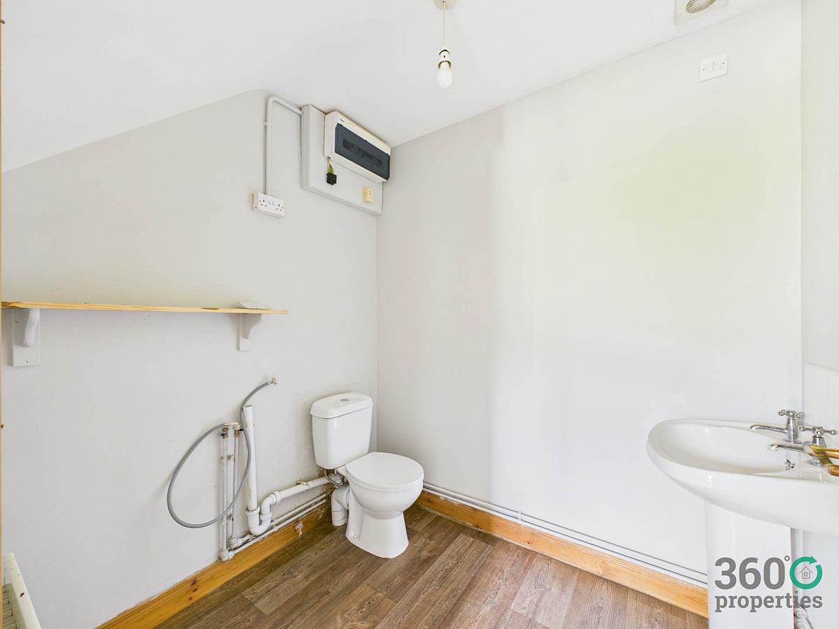 Low flush w/c and pedestal wash hand basin. Plumbed for washing machine. Linoleum floor.