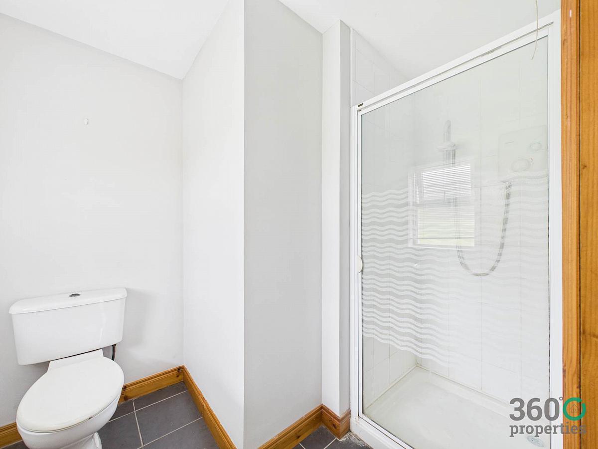Three piece suite comprising of low flush w/c, pedestal wash hand basin and Redring electric shower. Partly tiled walls. Tile floor.
