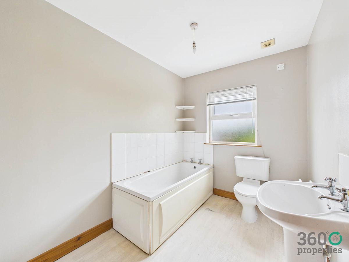 Three piece suite comprising of low flush w/c, pedestal wash hand basin and bath. Partly tiled walls. Linoleum floor.