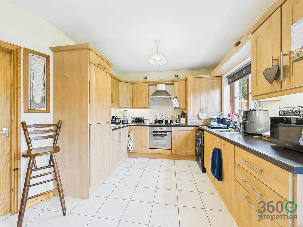 Range of eye and low level Beech shaker style units with black work top. Stainless steel sink with drainer bay and mixer tap. Integrated appliances include Indesit hob and oven with stainless steel extractor over, fridge/freezer and dishwasher. Plumbed for washing machine. French doors to rear. Tile floor.