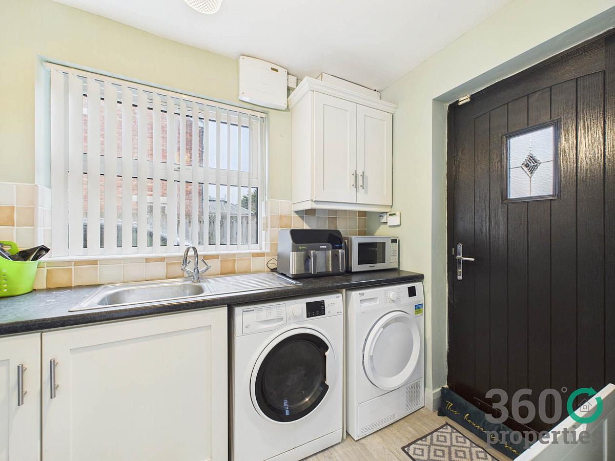 Range of eye and low level cream shaker style units with black speckled worktop. Stainless steel sink with drainer bay and mixer tap. Space for tumble dryer and plumbed for washing machine. Tile floor.
