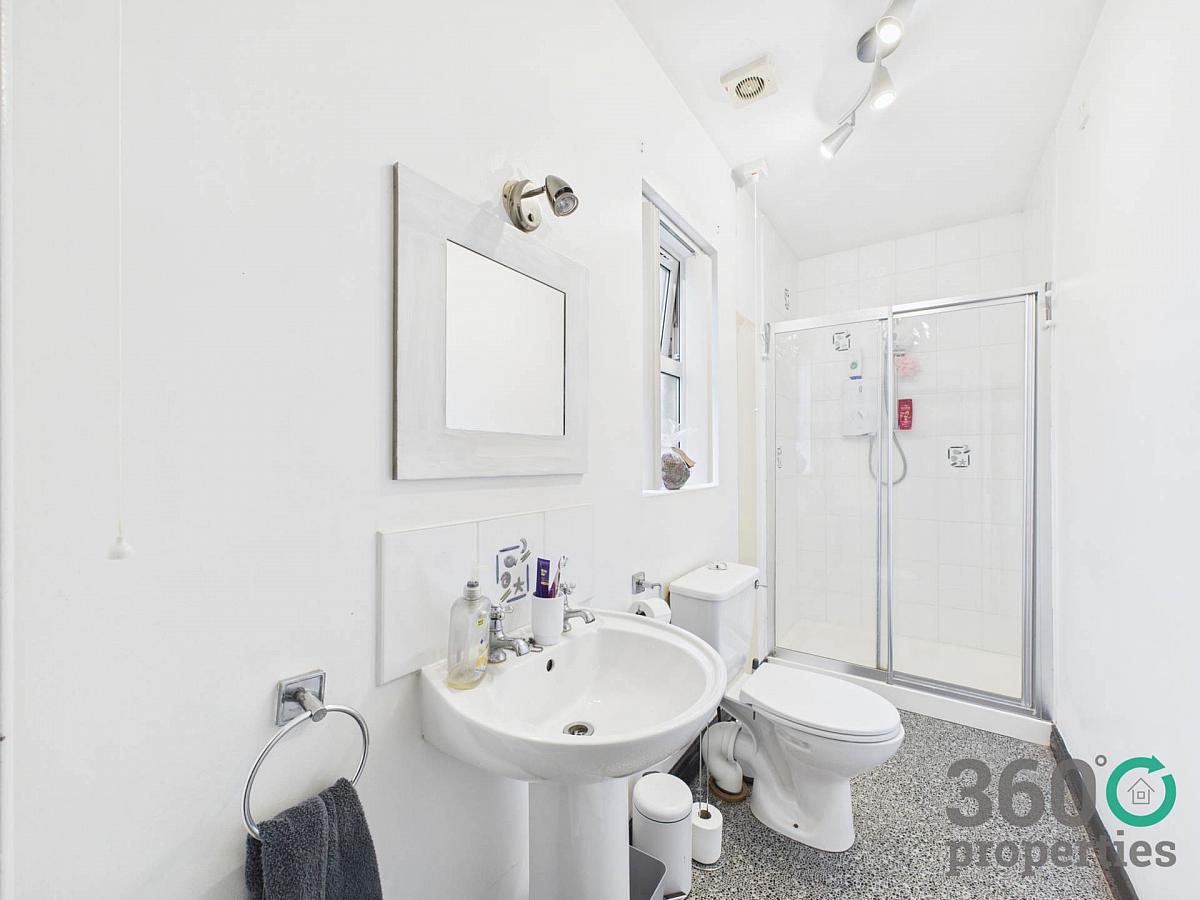 Three piece suite comprising of low flush w/c, pedestal wash hand basin and electric Mira shower. Linoleum floor.