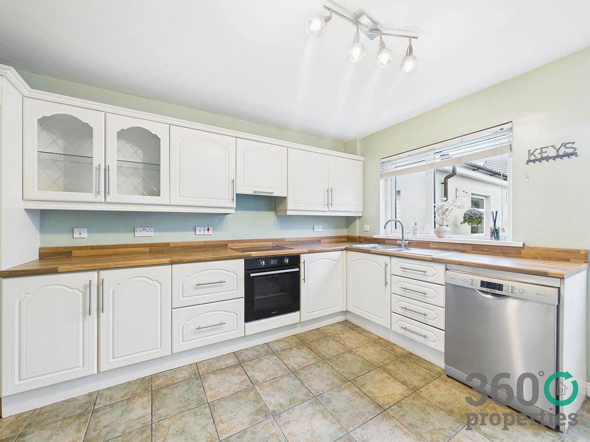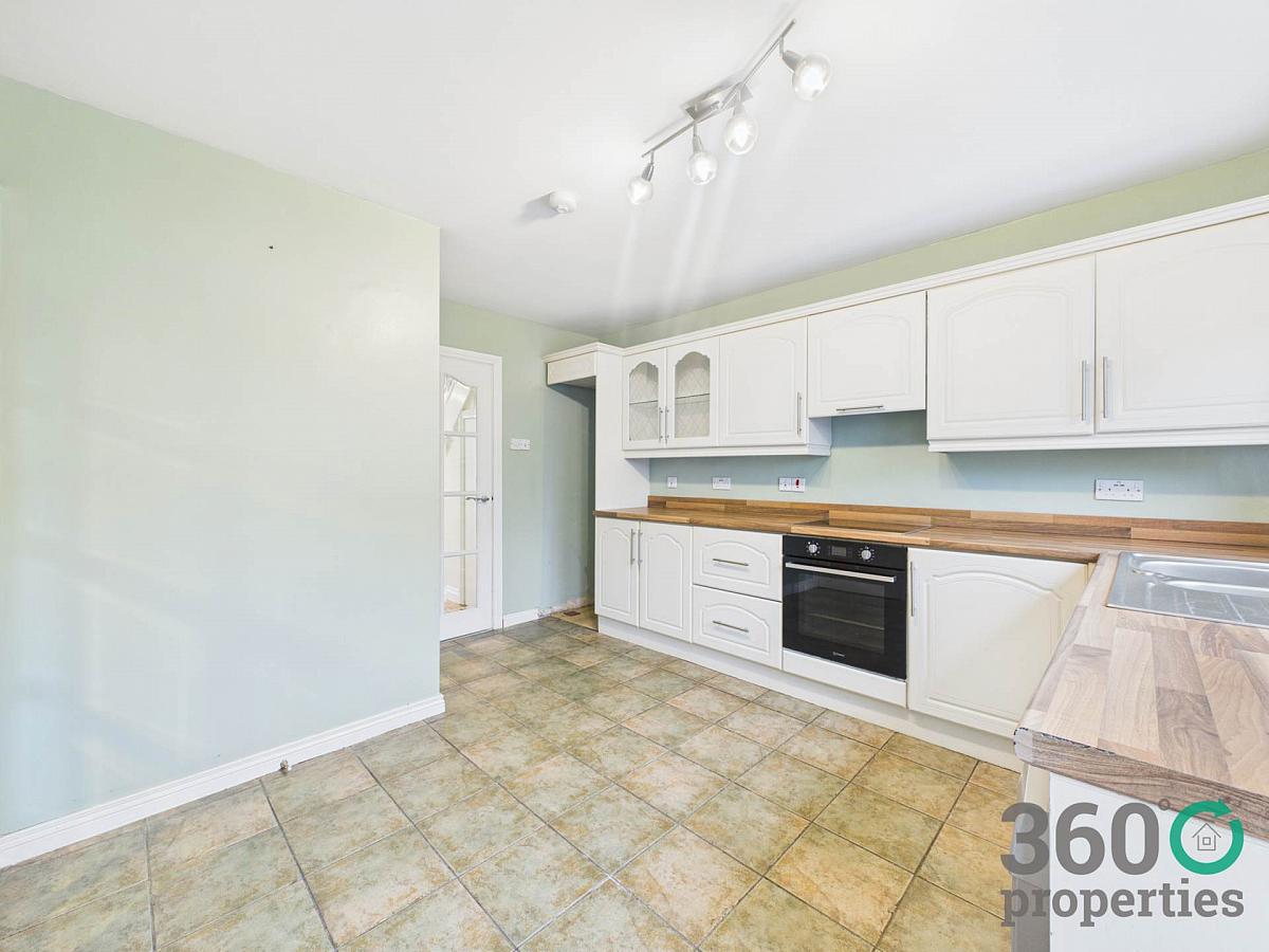 Range of eye and low level cream traditional style units with wooden effect work top. 1 ½ bowl stainless steel sink with drainer bay and mixer tap. Integrated appliances include Indesit hob and oven with extractor fan over. Plumbed for dishwasher and space for fridge/freezer. Tile floor.