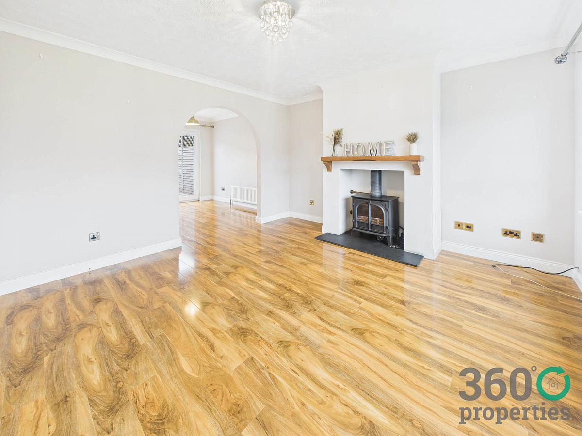 Multi-fuel stove with dual link up, tile hearth and oak mantel. Laminate floor.