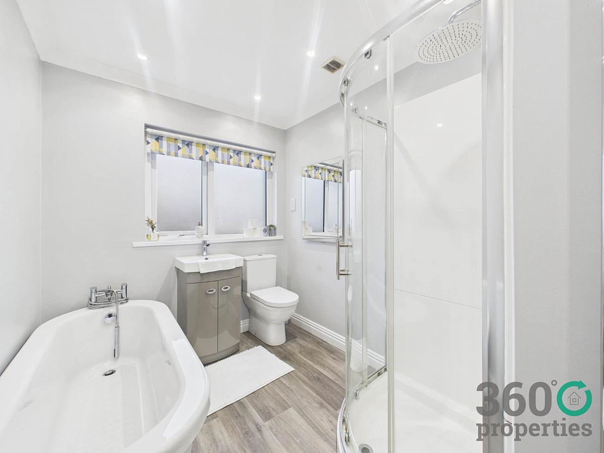 Four piece suite comprising of low flush w/c, vanity wash hand basin, bath and mains shower. Towel Radiator. With linoleum floor.