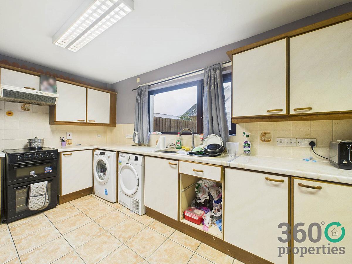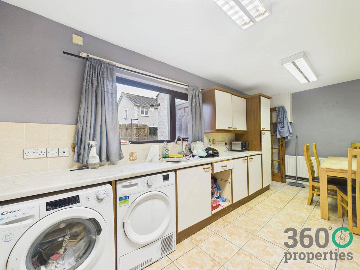 Range of eye and low level cream units with marble effect worktop. 1 ½ bowl cream resin sink and drainer bay with mixer tap. Space for hob/oven with extractor fan over. Plumbed for washing machine. Space for tumble dryer. Tile floor.