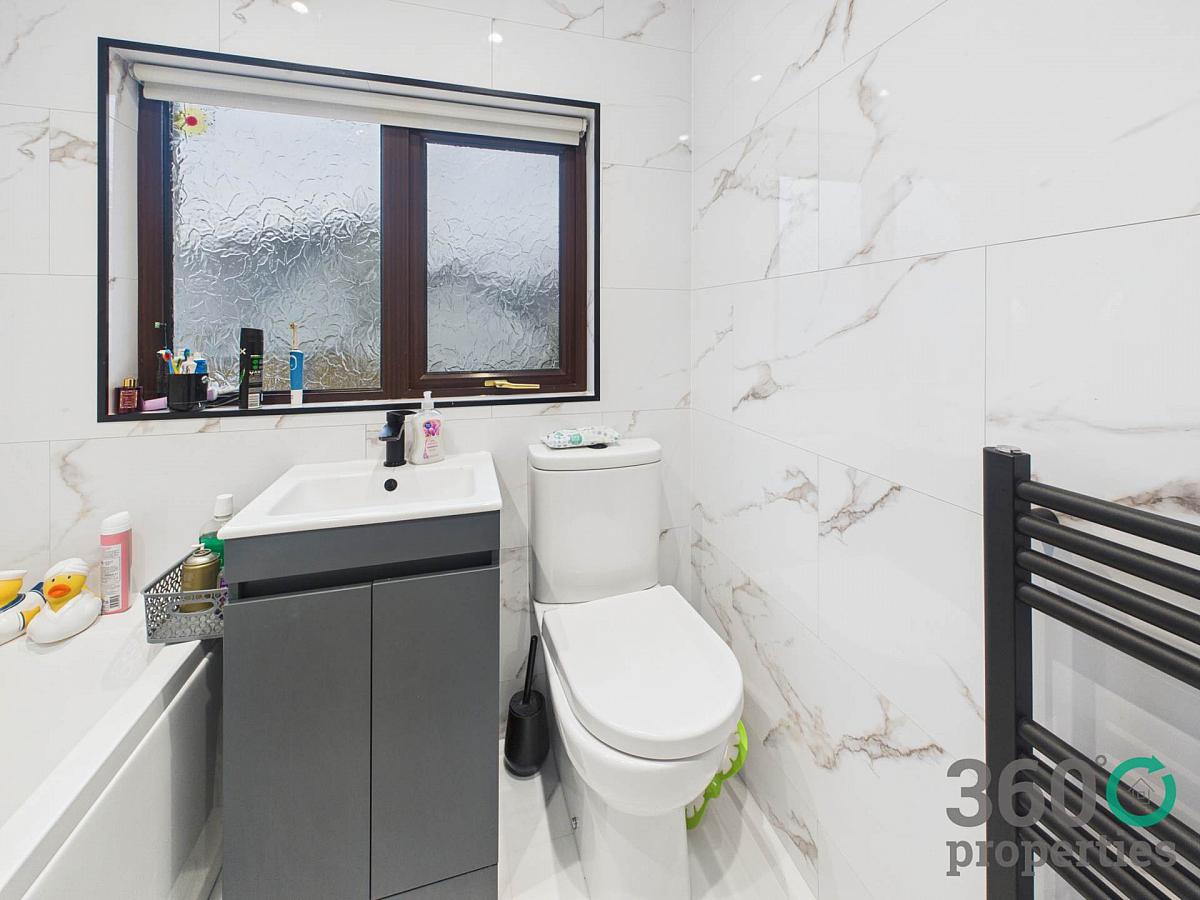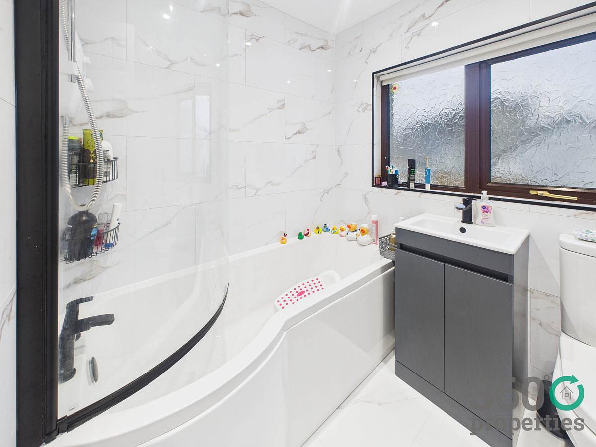 Three piece suite comprising of low flush w/c, vanity wash hand basin and Mira electric shower over bath. Fully tiled walls and floor.