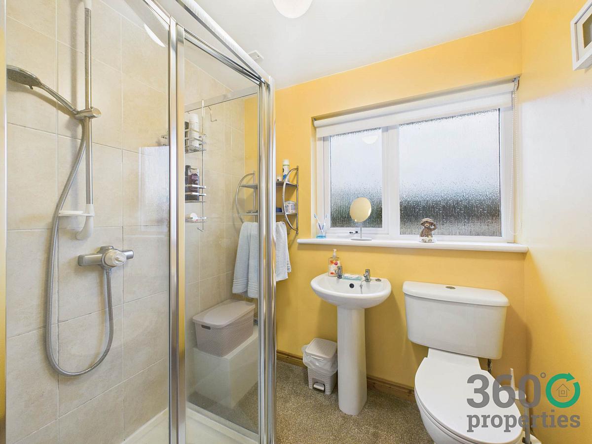 Three piece suite comprising low flush w/c, pedestal wash hand basin and mains shower. Partly tiled walls. With carpet.