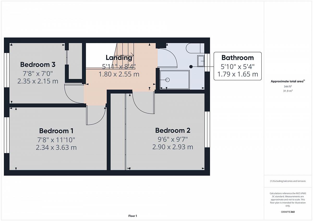 Three piece suite comprising of low flush w/c, vanity wash hand basin and triton electric shower. Towel radiator. Fully tiled walls and floor.