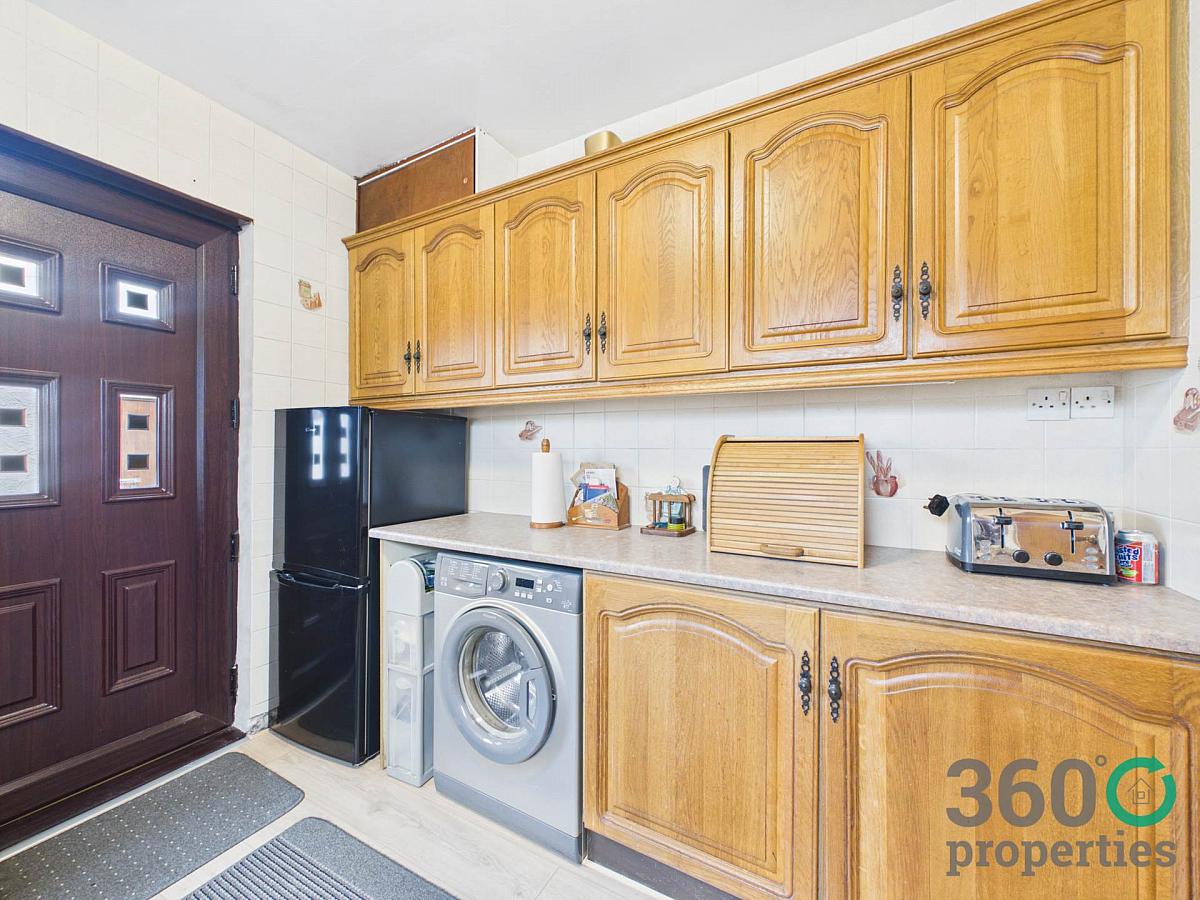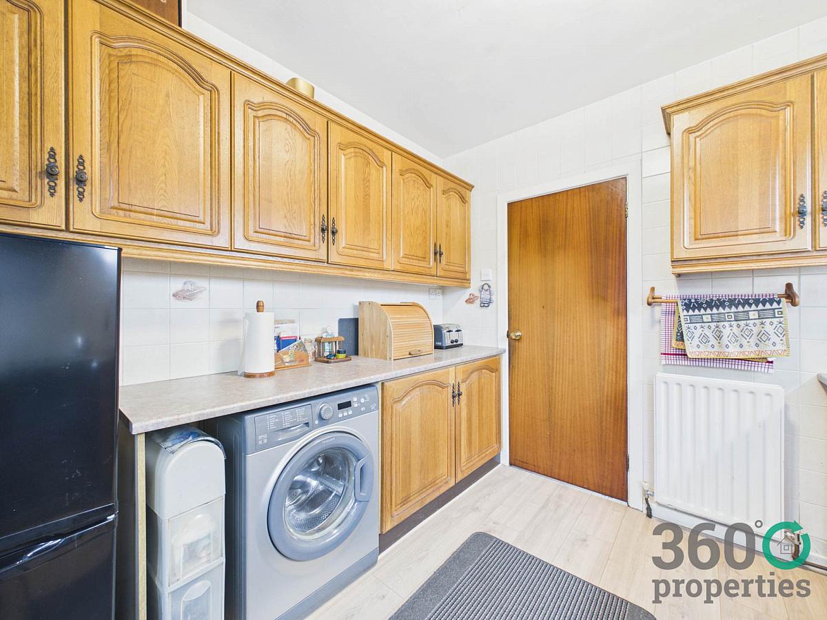 Range of eye and low level farmhouse style units with speckled worktops. Stainless steel sink with drainer bay and mixer tap. Space for cooker and fridge/freezer. Plumbed for washing machine. Laminate floor.