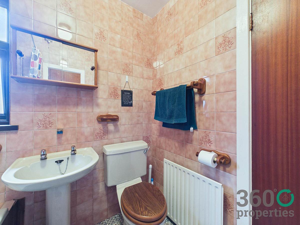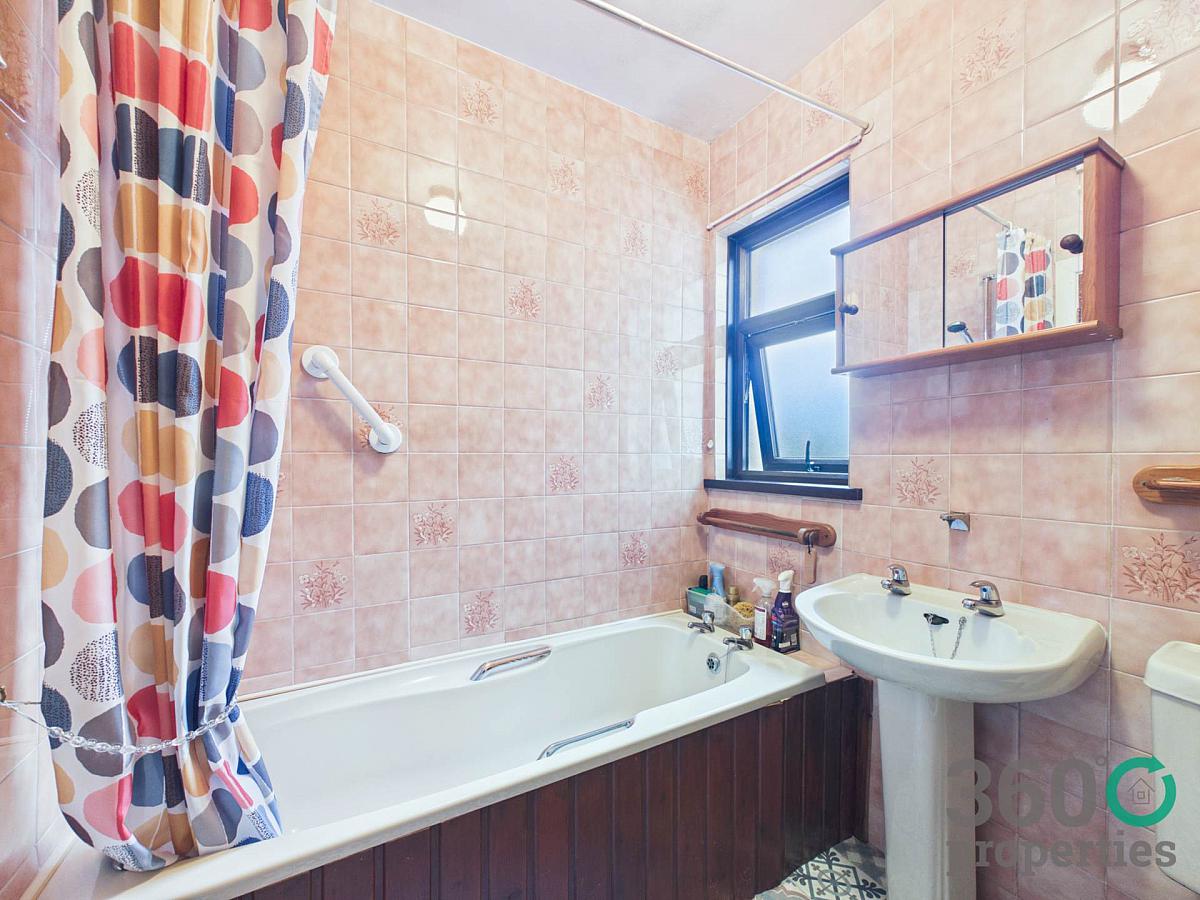 Three piece suite comprising of low flush w/c, pedestal wash hand basin and bath with Triton electric shower over. Fully tiled walls. Hotpress. Mosaic linoleum floor.