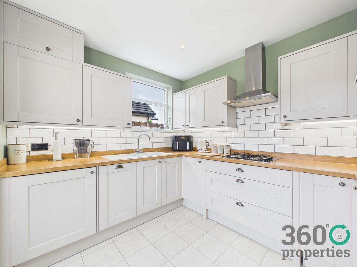 Range of eye and low level grey shaker style units, with wooden effect work top. 1 ½ bowl grey resin sink with drainer bay and mixer tap. Integrated appliances include four ring gas hob with Stainless steel extractor fan over, electric oven, dishwasher and fridge. Tile floor.