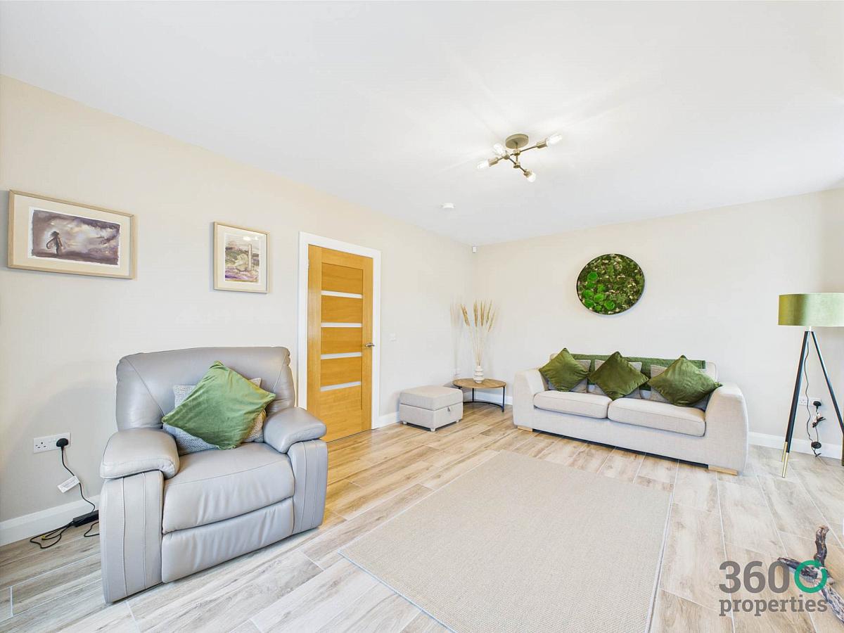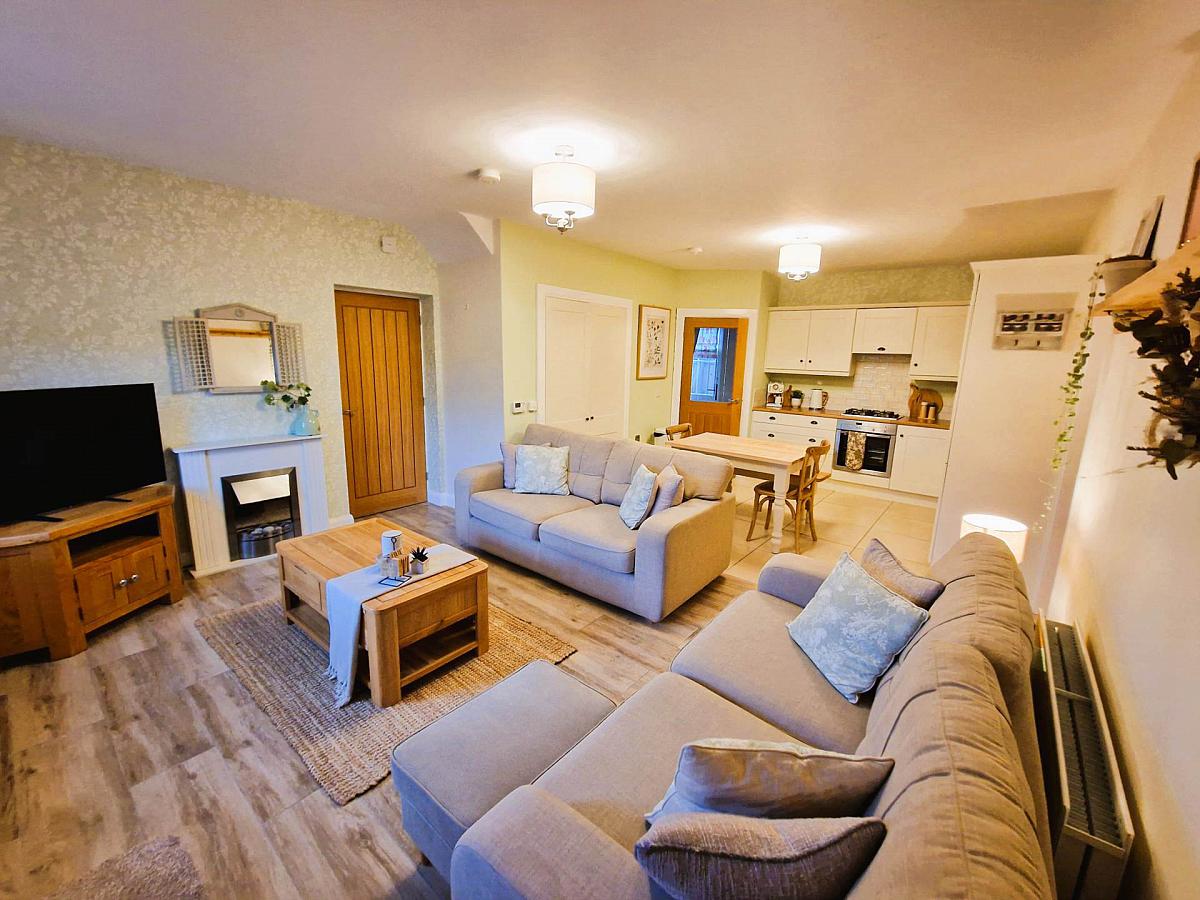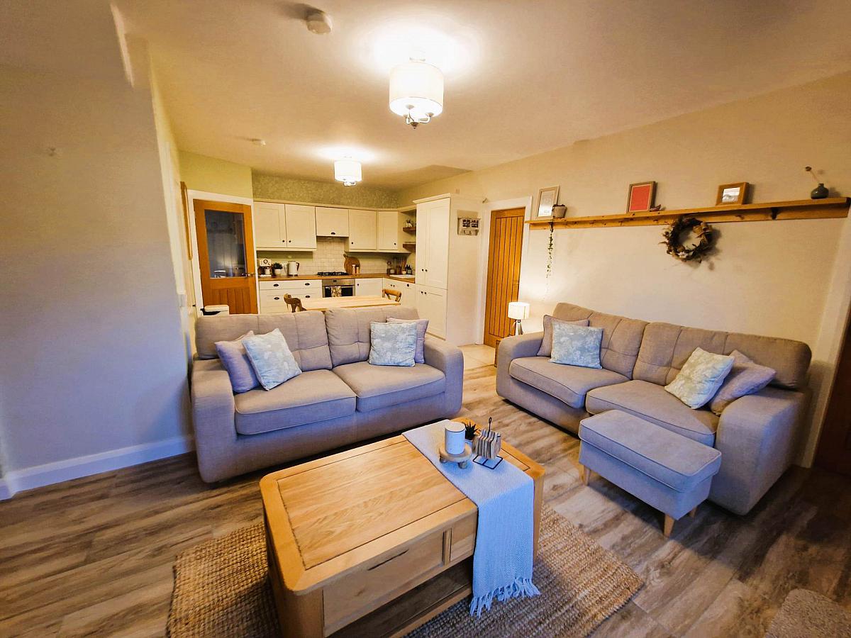 Range of eye and low level cream shaker style units with wooden effect work top. Belfast sink with mixer tap. Integrated appliances include Neff gas hob and oven, fridge/freezer and dishwasher. Tile floor. Living area with electric feature fire with cream surround. Wooden effect tile floor.