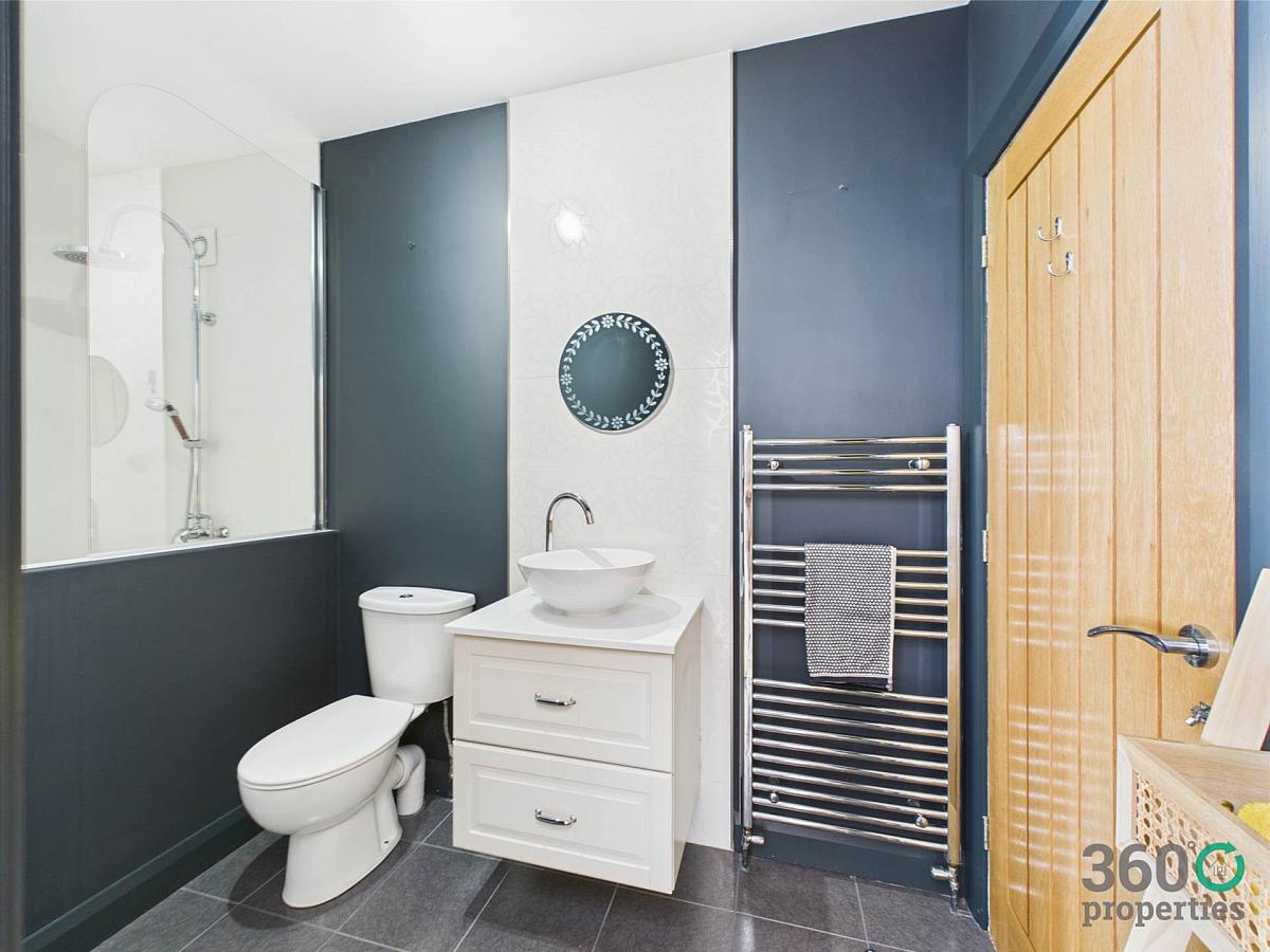 Three piece suite comprising of low flush w/c,floating vanity wash hand basin and mains shower. Towel Radiator. Tile floor.