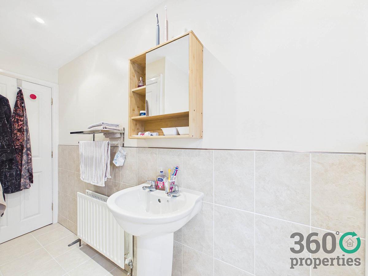 Range of eye and low level white shaker style units with black speckled work top. Stainless Steel sink with drainer bay and mixer tap. Integrated appliances include dishwasher, Hotpoint hob and oven with extractor fan over. Space for fridge/freezer. Plumbed for washing machine. Cloakroom. Tile floor.
