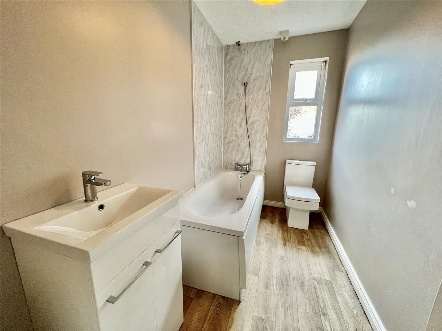 Modern fitted three piece suite comprising panelled bath, vanity unit and WC.