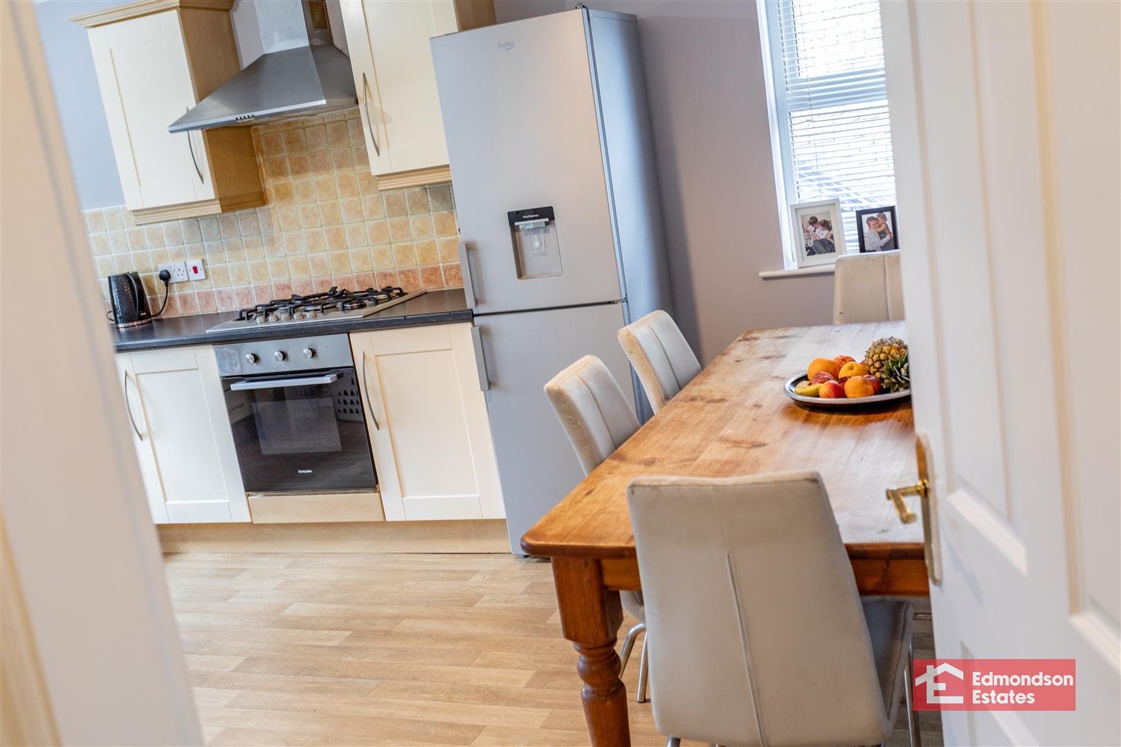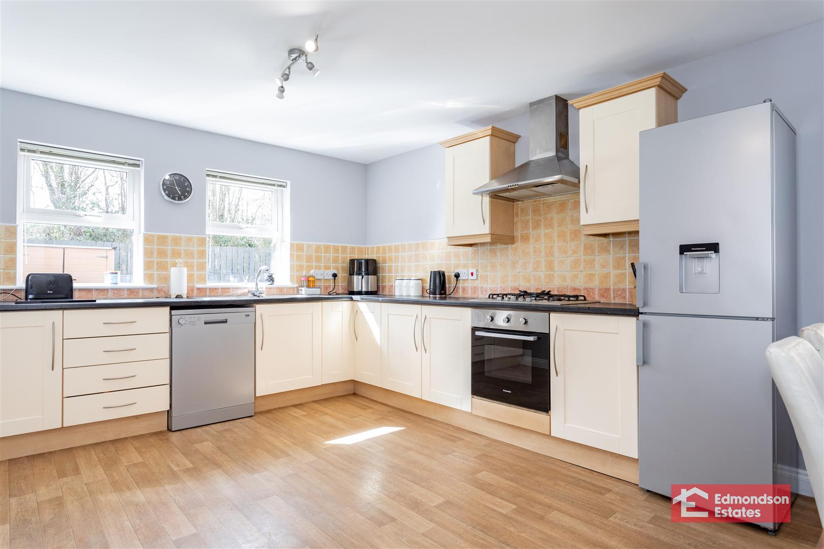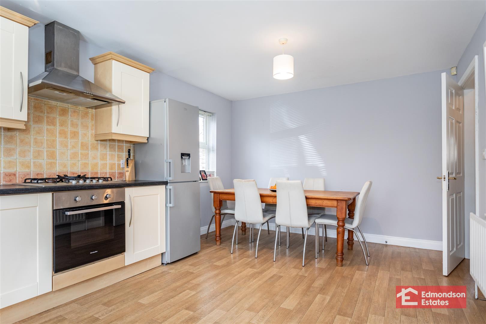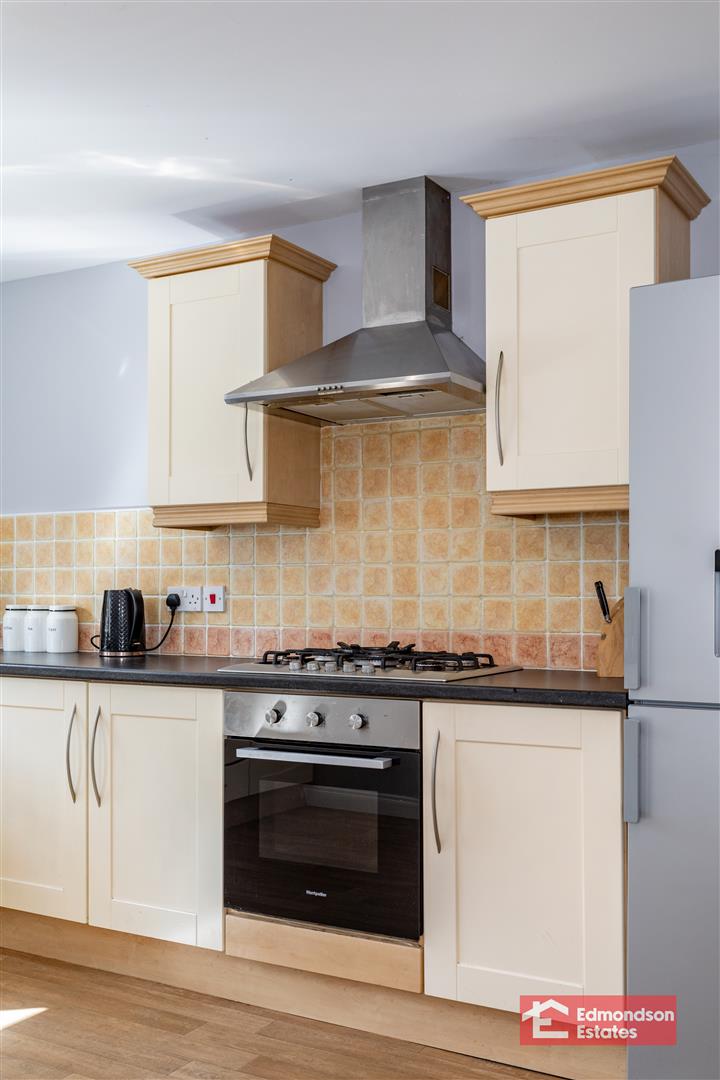 High and low level units. Gas hob with stainless steel hood. Electric oven. Stainless steel sink, Space for dishwasher. Tiled splashback. Laminate flooring. Space for large family dining table.