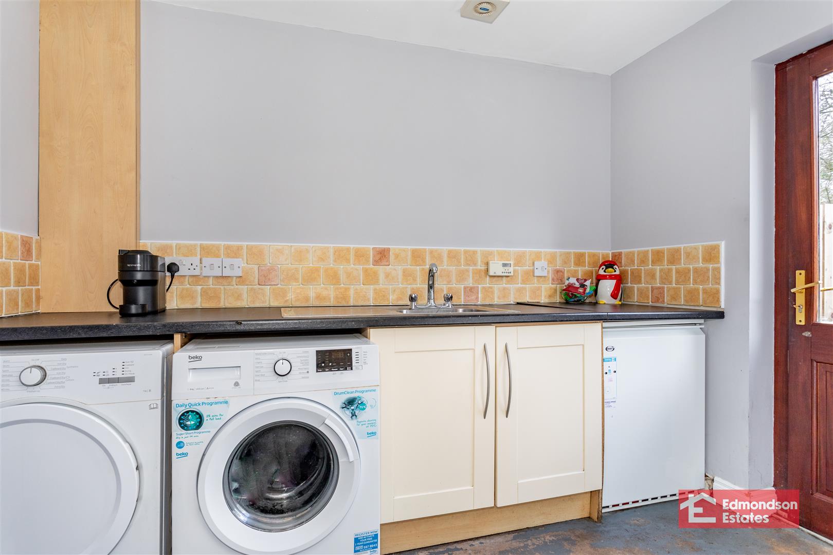 High and low level units. Plumbed for washing machine, space for tumble dryer. Tiled splashback. Back door.