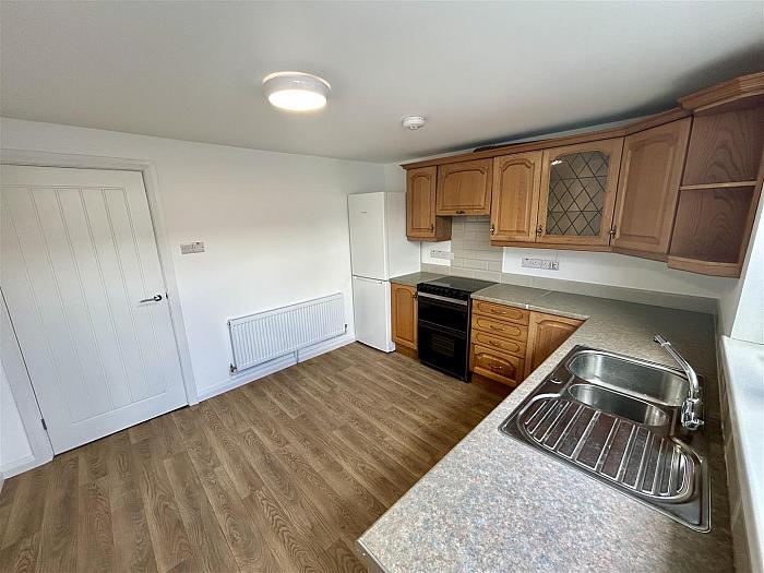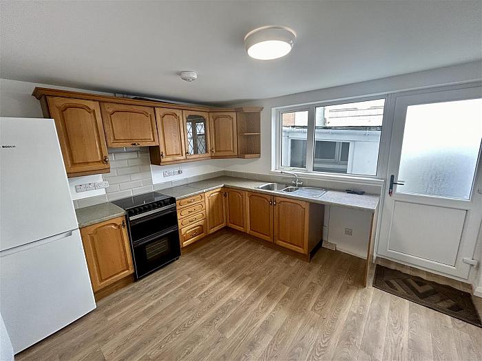 Refitted high and low level units with display cabinet. 1 1/2 stainless steel sink. Space for fridge/freezer. Space for freestanding cooker/oven. Tiled splash back. Vinyl flooring. Space for informal family dining table. Back door.