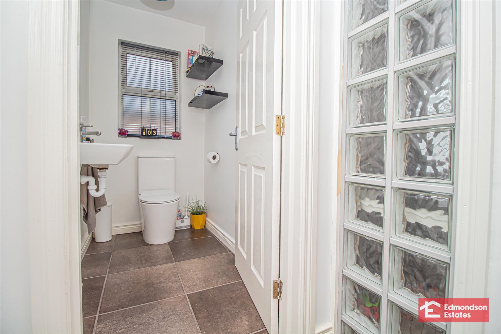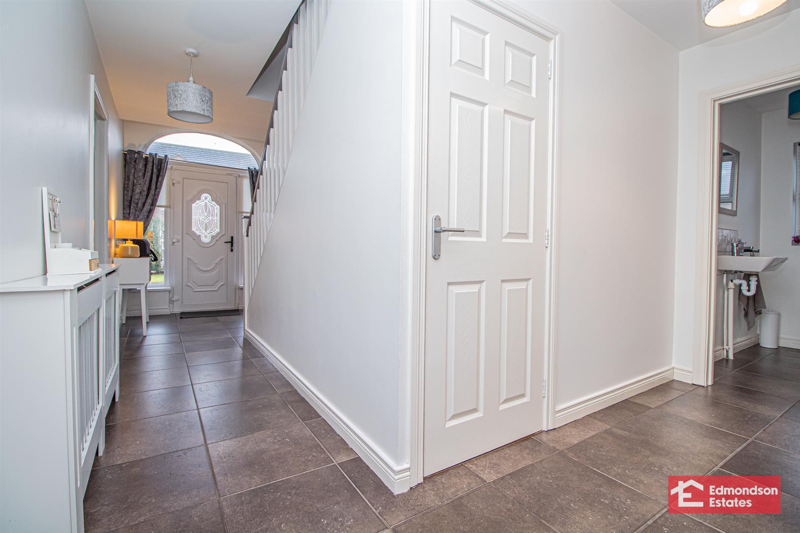 PVC double glazed front door with side screens. Stairwell to first floor. Access to under stair store. Alarm panel. Tiled floor.