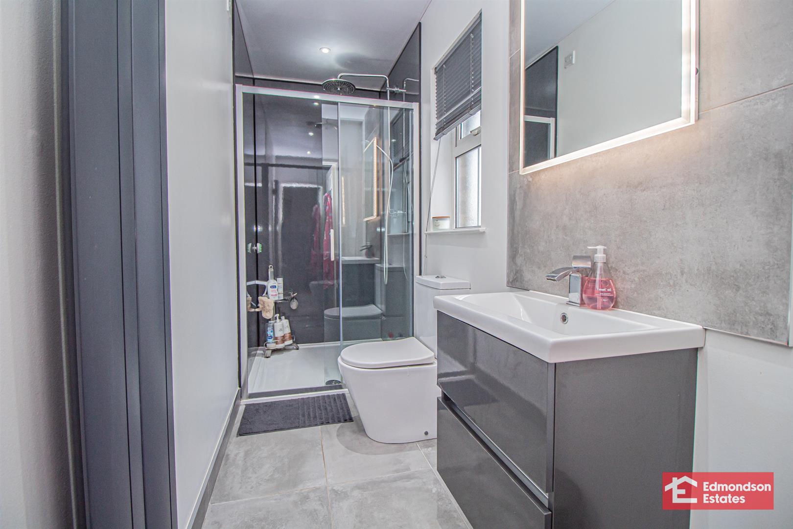 Modern fitted three piece suite comprising shower enclosure with mains shower and drench shower head over, floating vanity unit and WC. Fully panelled walls to shower. Tiled floor.