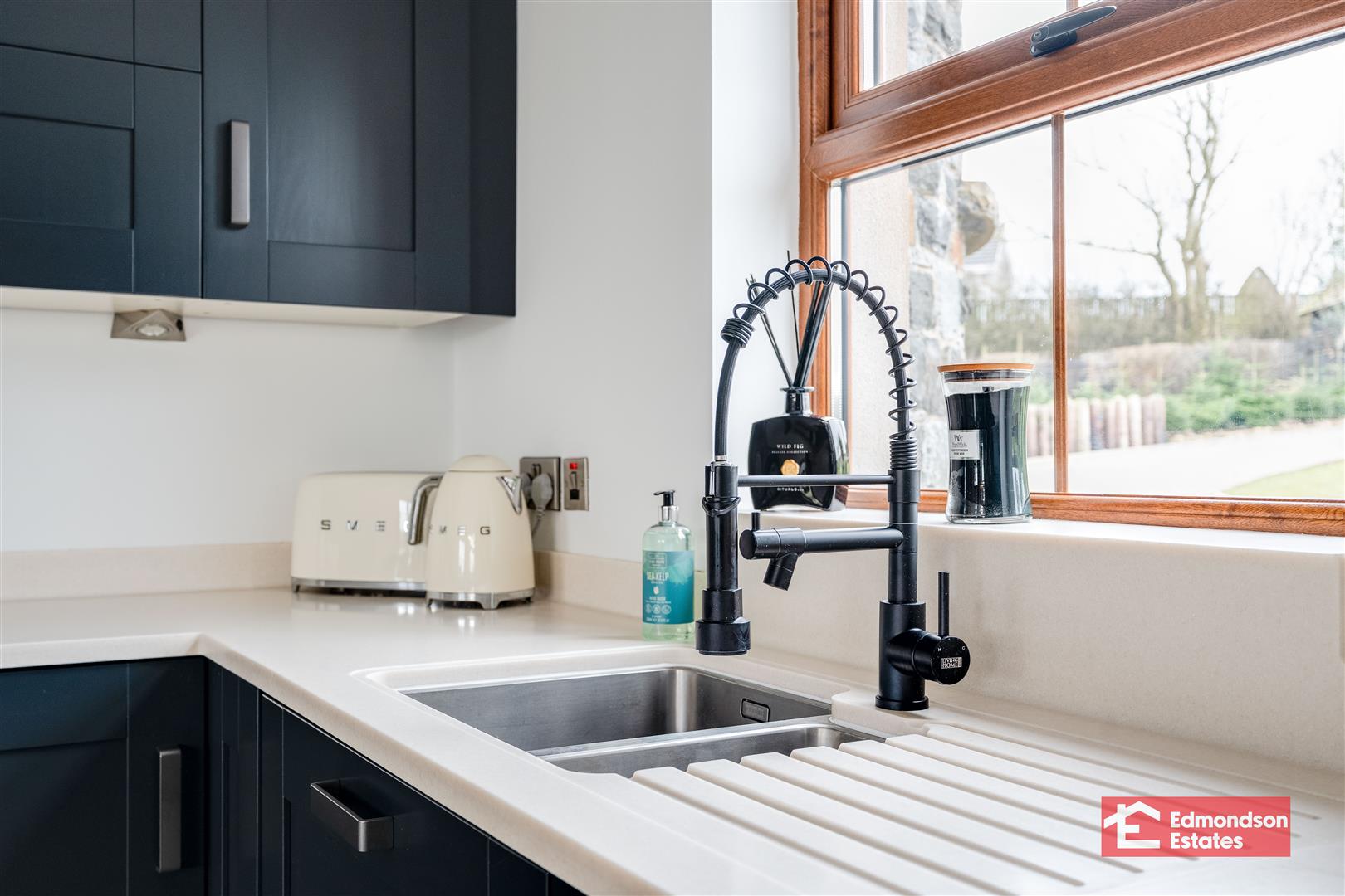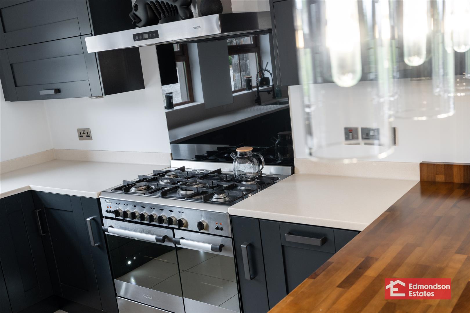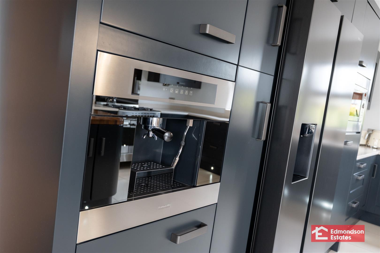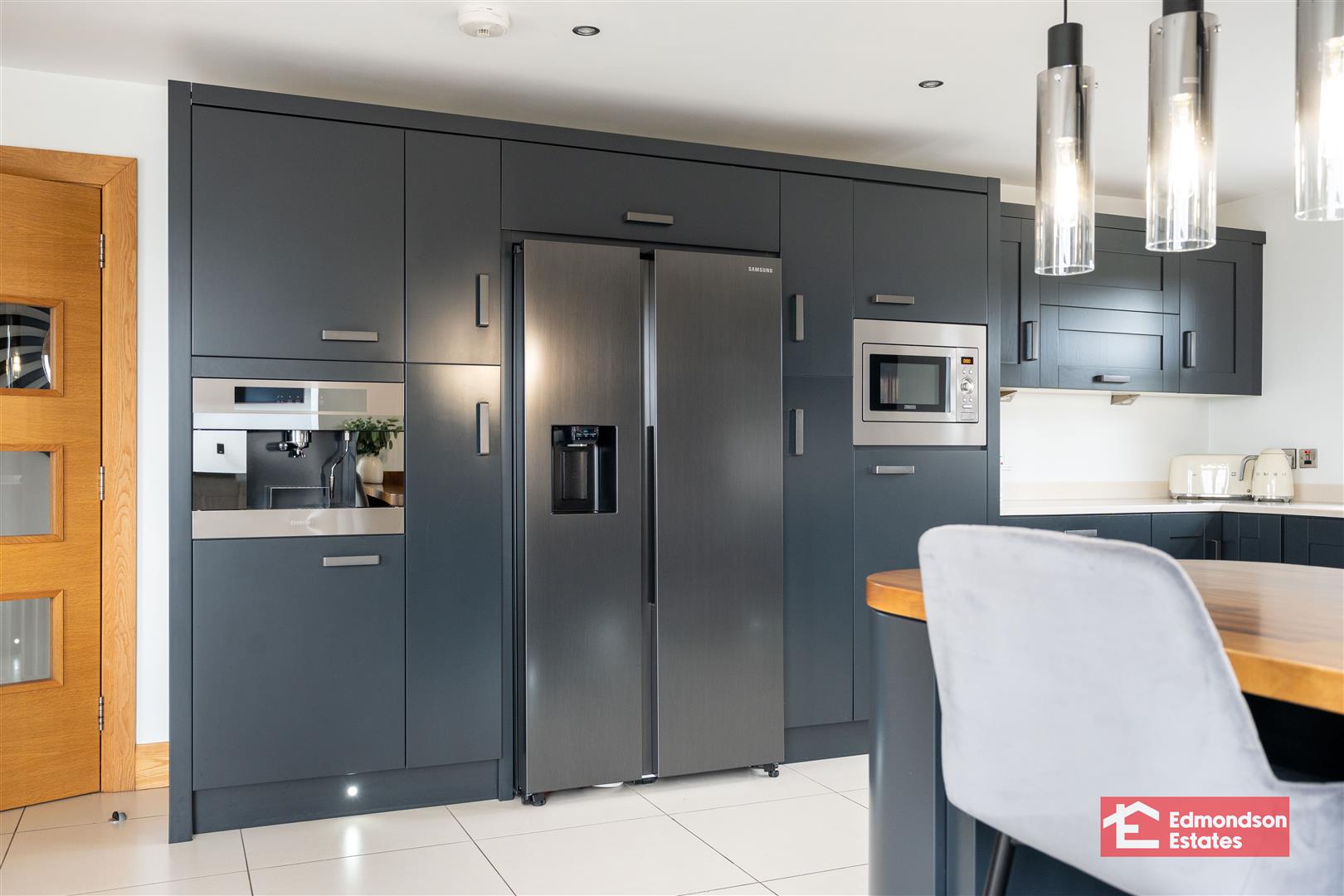 Graphite grey, high and low level units with Corian worktop with breakfast bar over hang. 1 1/2 bowl stainless steel sink. Integrated coffee machine, microwave, and dishwasher. Plumbed American style fridge / freezer. Space for Dual fuel range cooker with inglenook. Stainless steel extractor hood. Space for large family dining table. Porcelain tiled flooring. Double doors to rear patio.