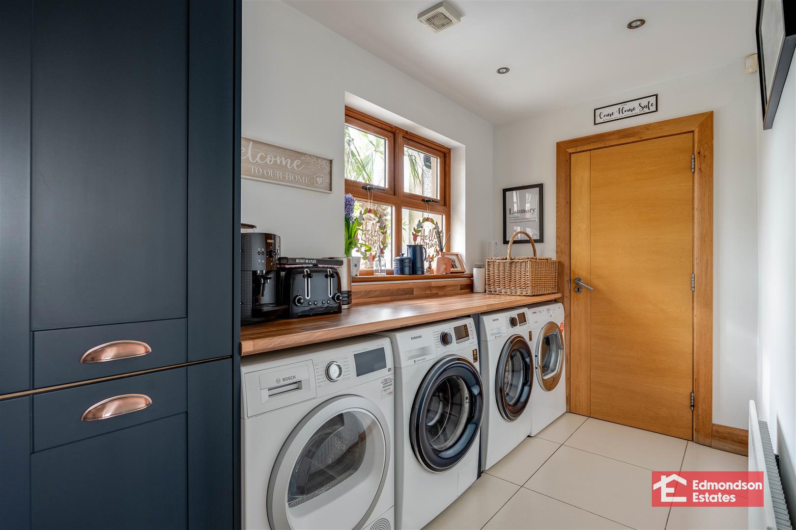 High and low level wall units. Plumbed for 2no. washing machines and space for 2no. tumble dryers. Porcelain tiled flooring.