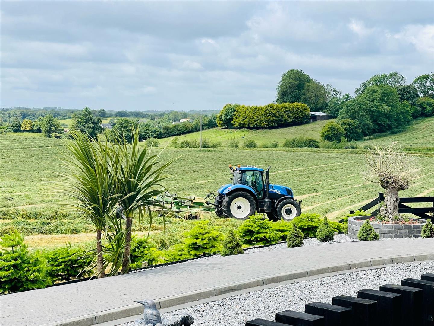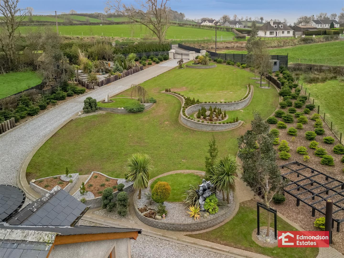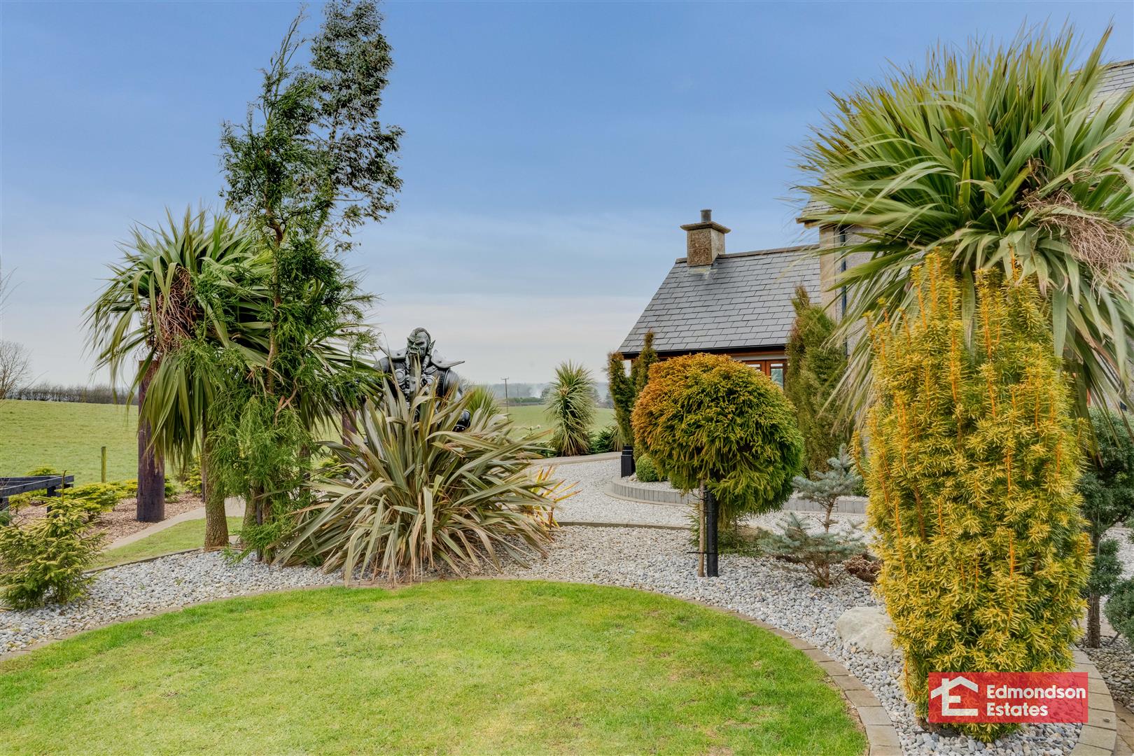 Exceptional professionally landscaped low maintenance gardens, including large pond with feature waterfall and filtration system. Large brick pavia patio orientated to take advantage of the open countryside views and the afternoon sun. Comprehensive external feature LED lighting. Gardens laid in lawns, raised stone beds with manicured shrubs, and evergreens.