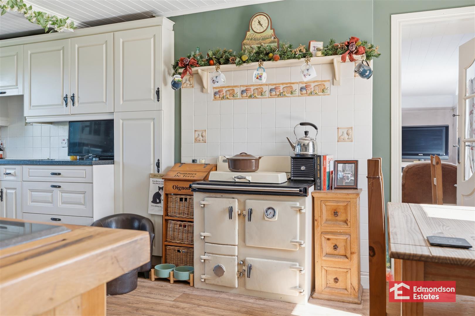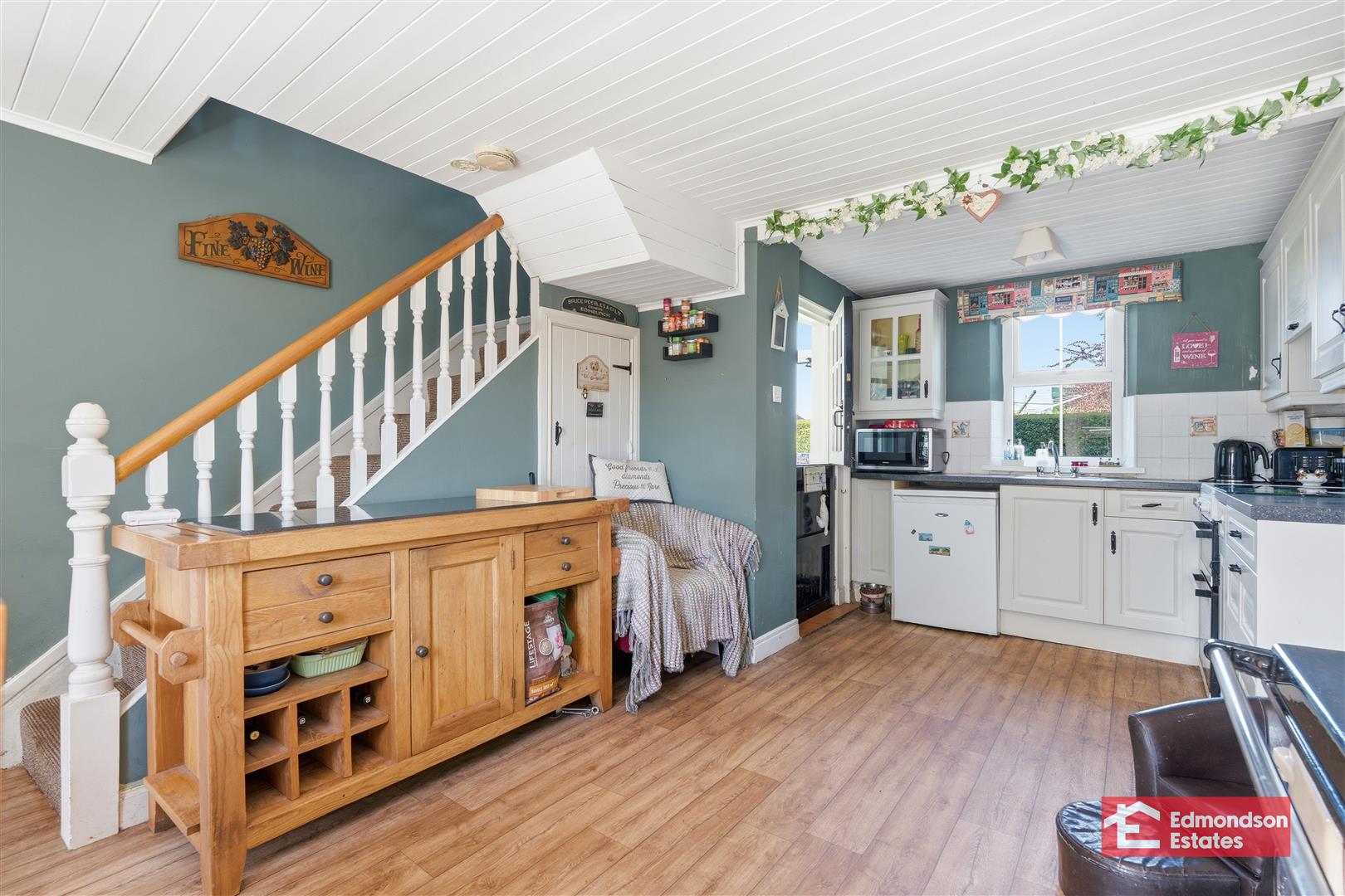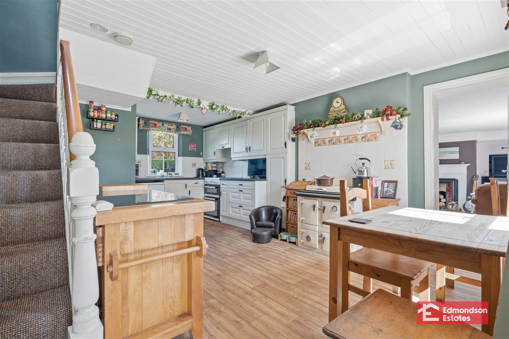 High and low level storage units and work surfaces. Stainless steel sink unit. Cooker with hob. Space for low level fridge. Rayburn range style oven. Dual aspect windows. Stairwell to first floor. Access to under stair store. Tiled floor.