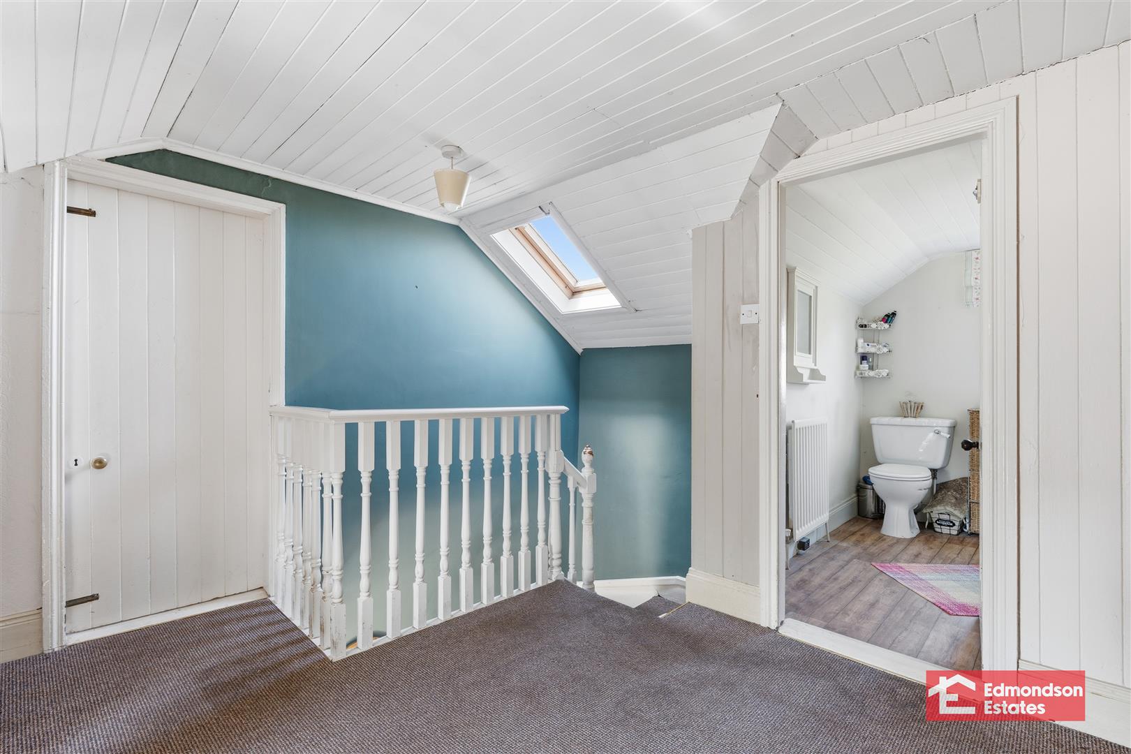 Dual aspect windows. Shower cubicle with mains shower over. Panelled walls to shower. Feature cast iron fireplace.