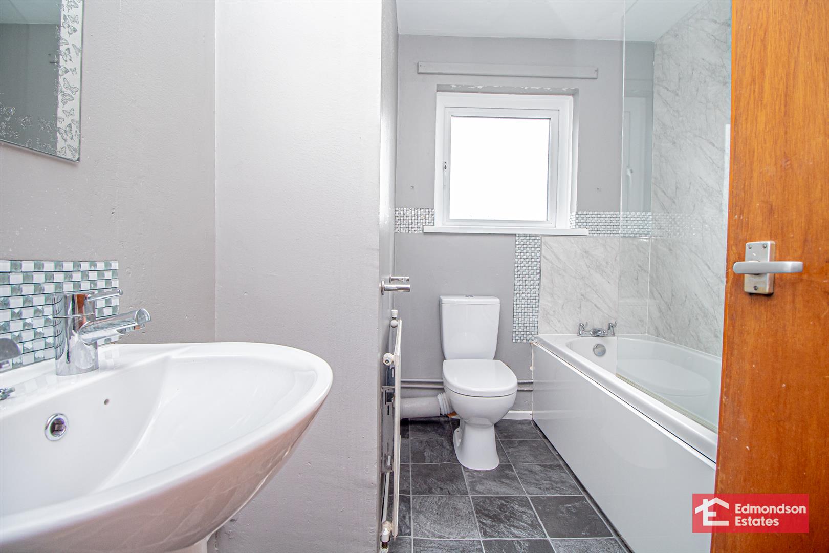 Modern fitted three piece suite comprising panelled bath with electric shower over, wash hand basin and WC. Part panelled walls.