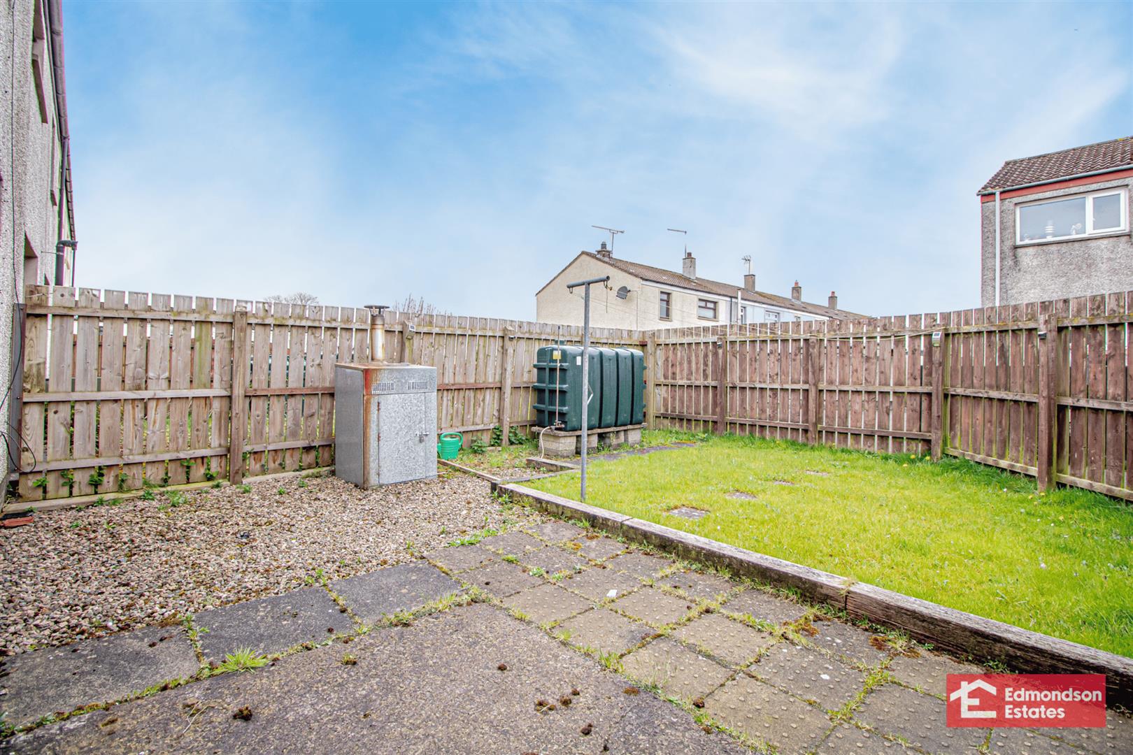 Enclosed rear garden in lawn with stoned patio area.