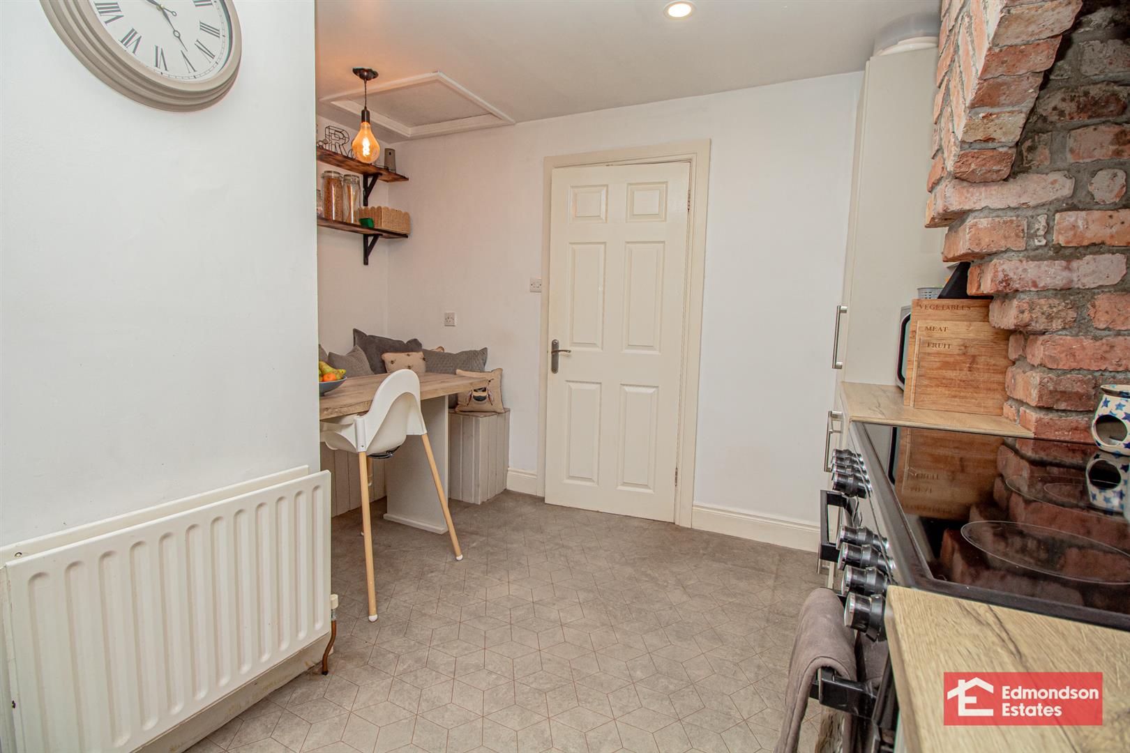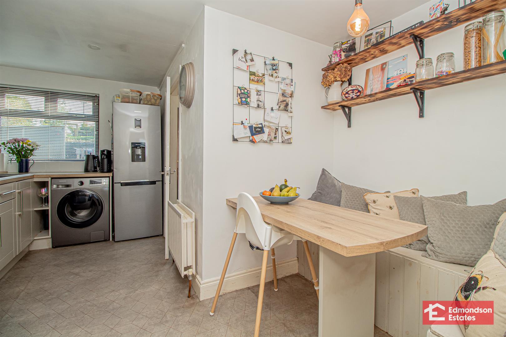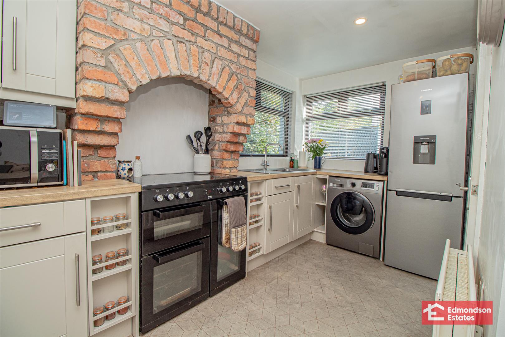 widest points. Modern fitted shaker style kitchen with high and low level storage units and work surfaces. Space for fridge freezer and washing machine. Stainless steel sink unit. Beko range oven with 5 ring electric hob. Access to roof space. Part tiled walls.