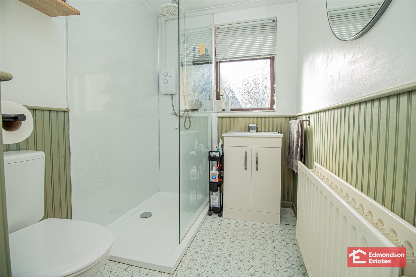 Modern fitted three piece suite comprising shower enclosure with electric shower over, vanity unit and WC. Access to hot press.