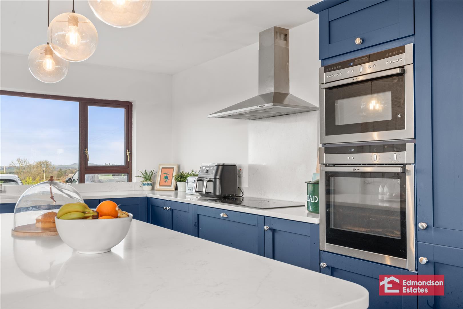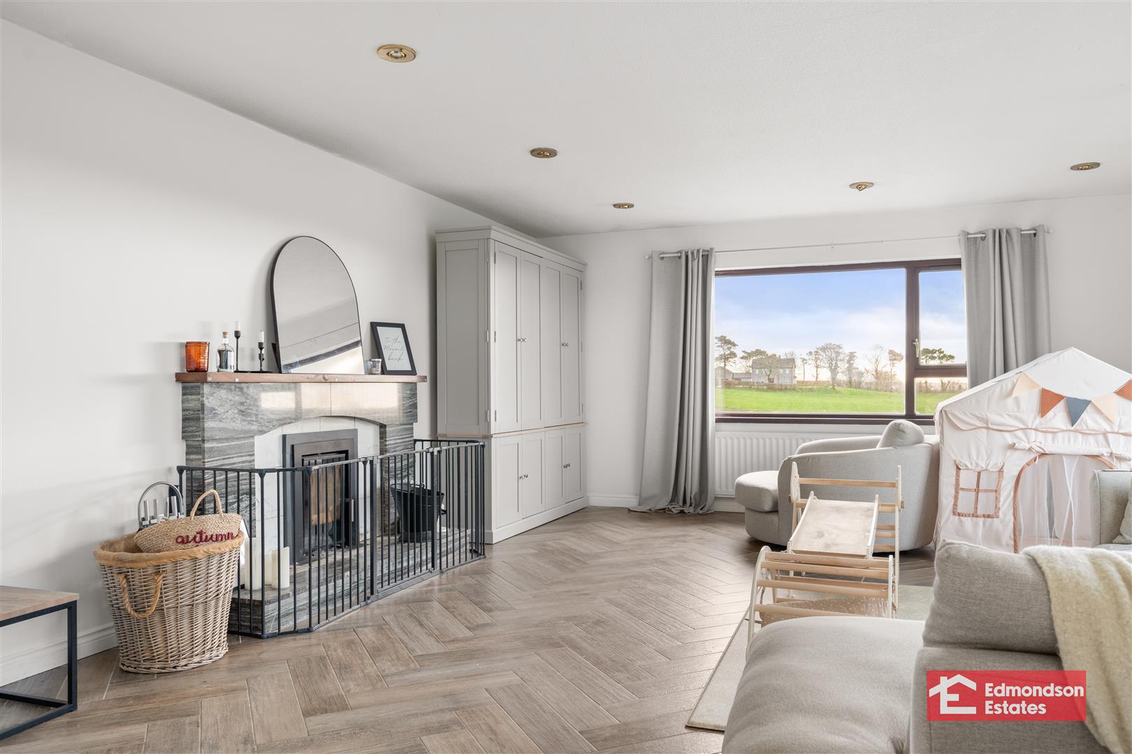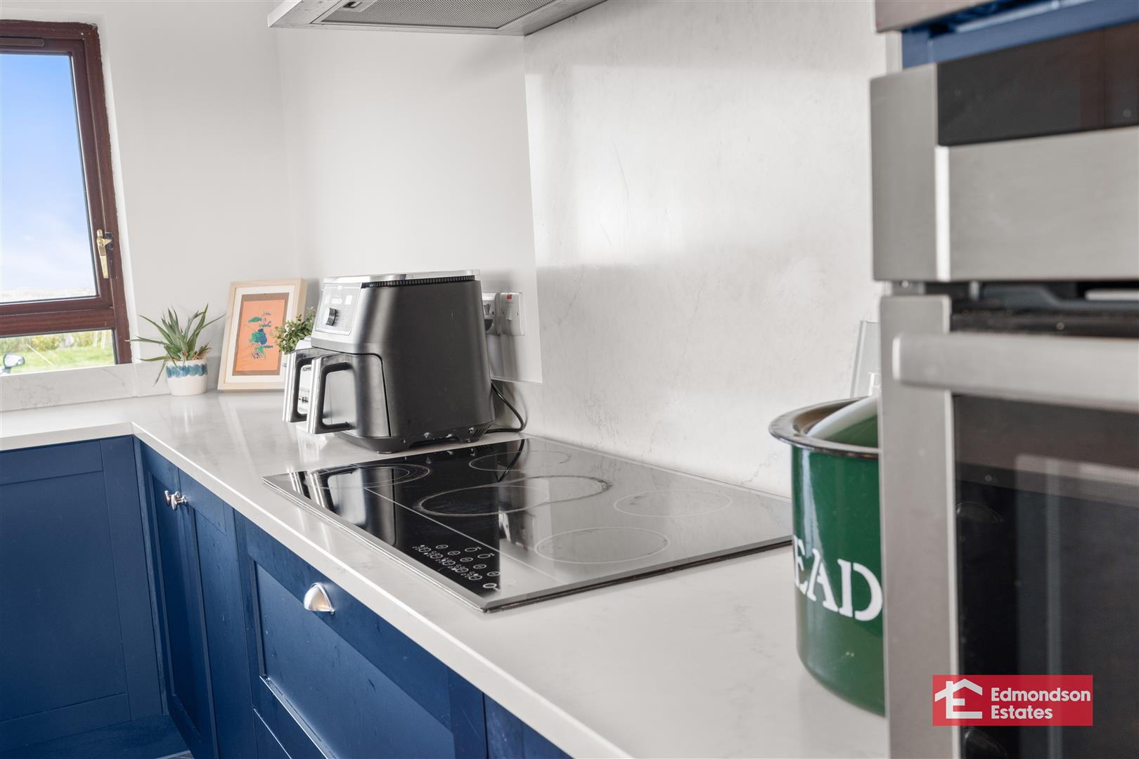 Recessed multi fuel stove. Dual aspect panoramic windows. Tiled flooring.