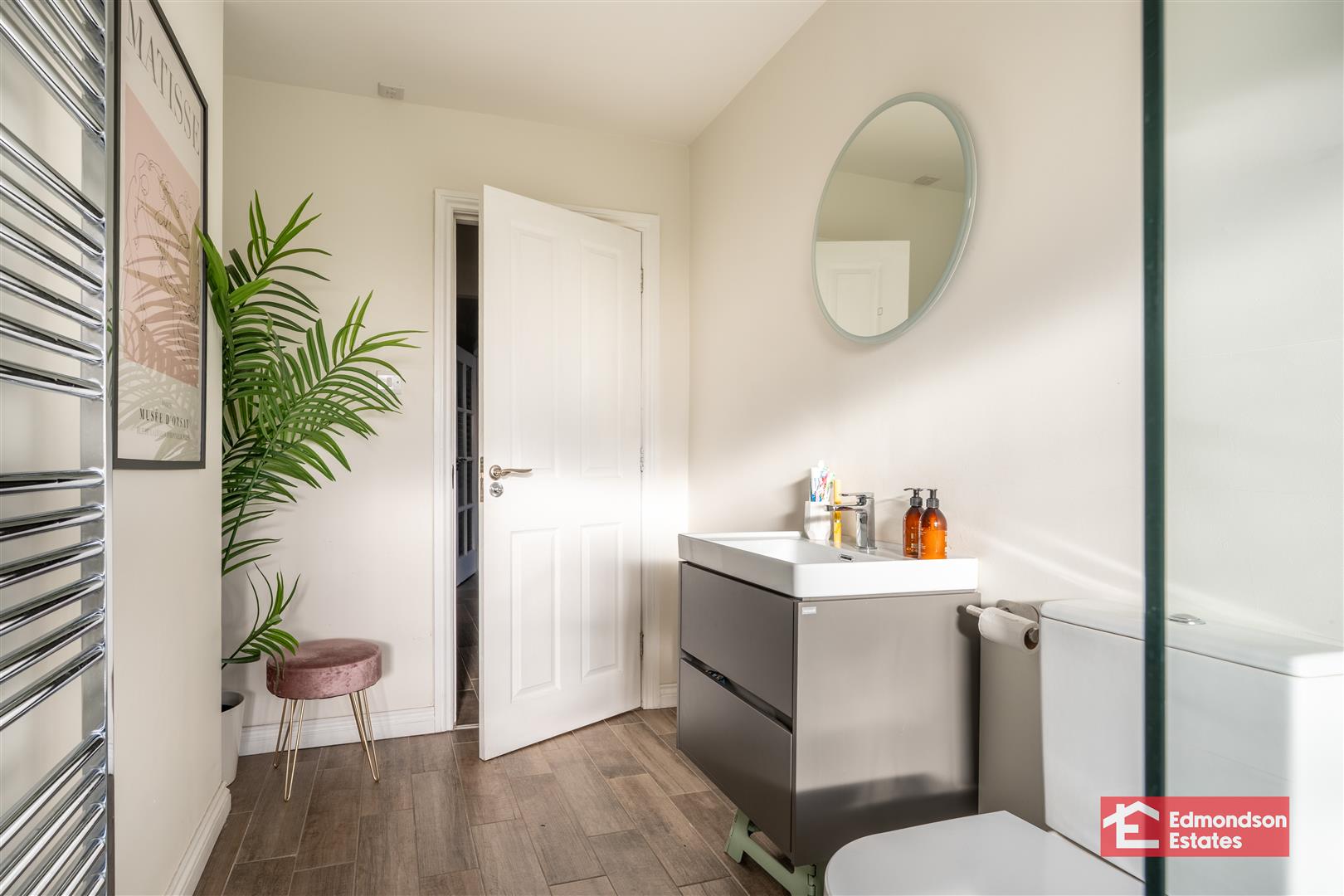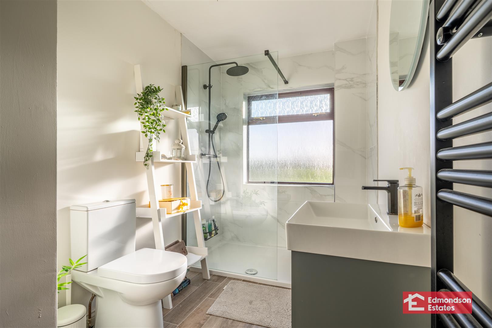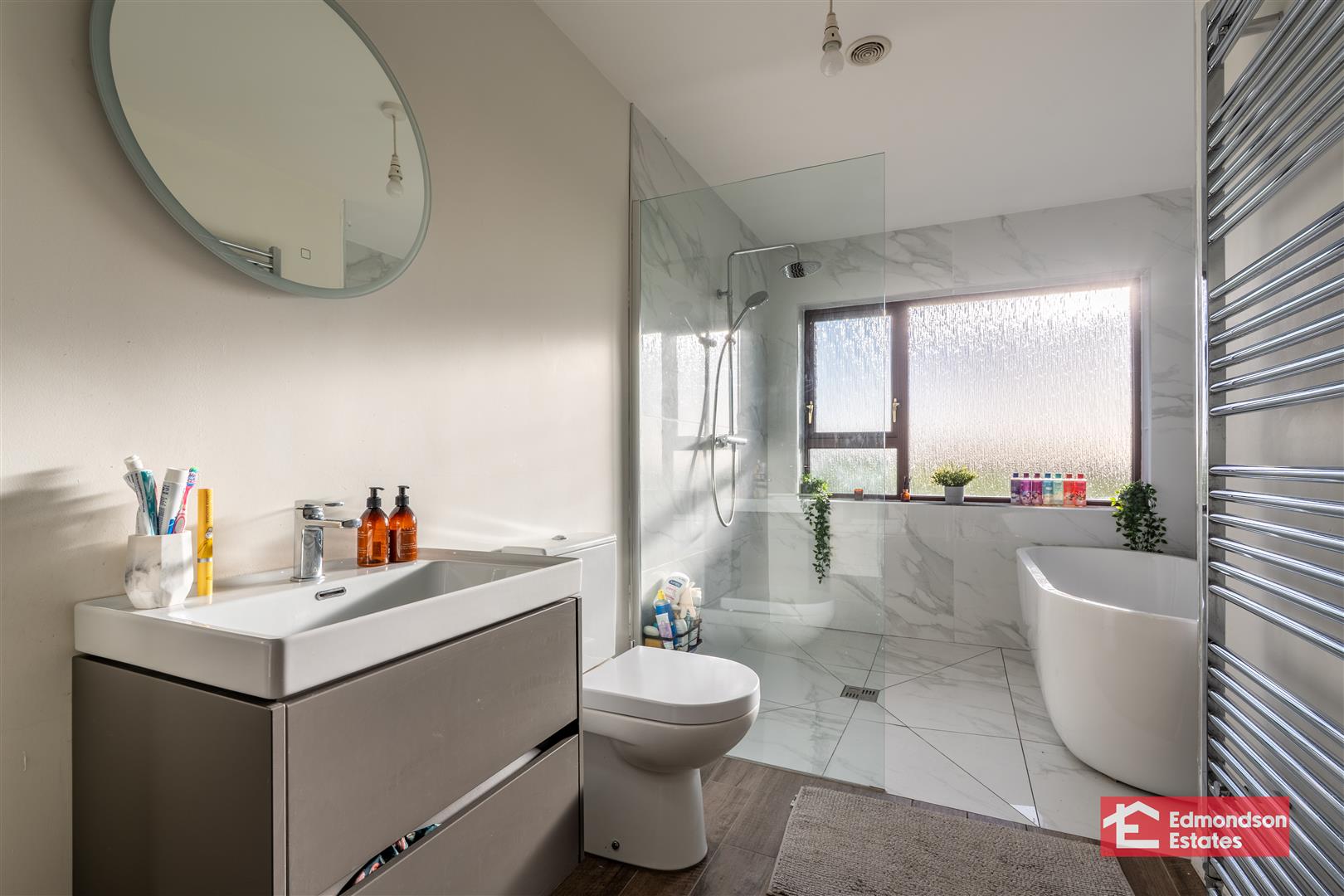 Refitted suite with large contemporary style bath, with WHB and LFWC. Walk in shower. Chrome towel radiator. Tiled flooring.