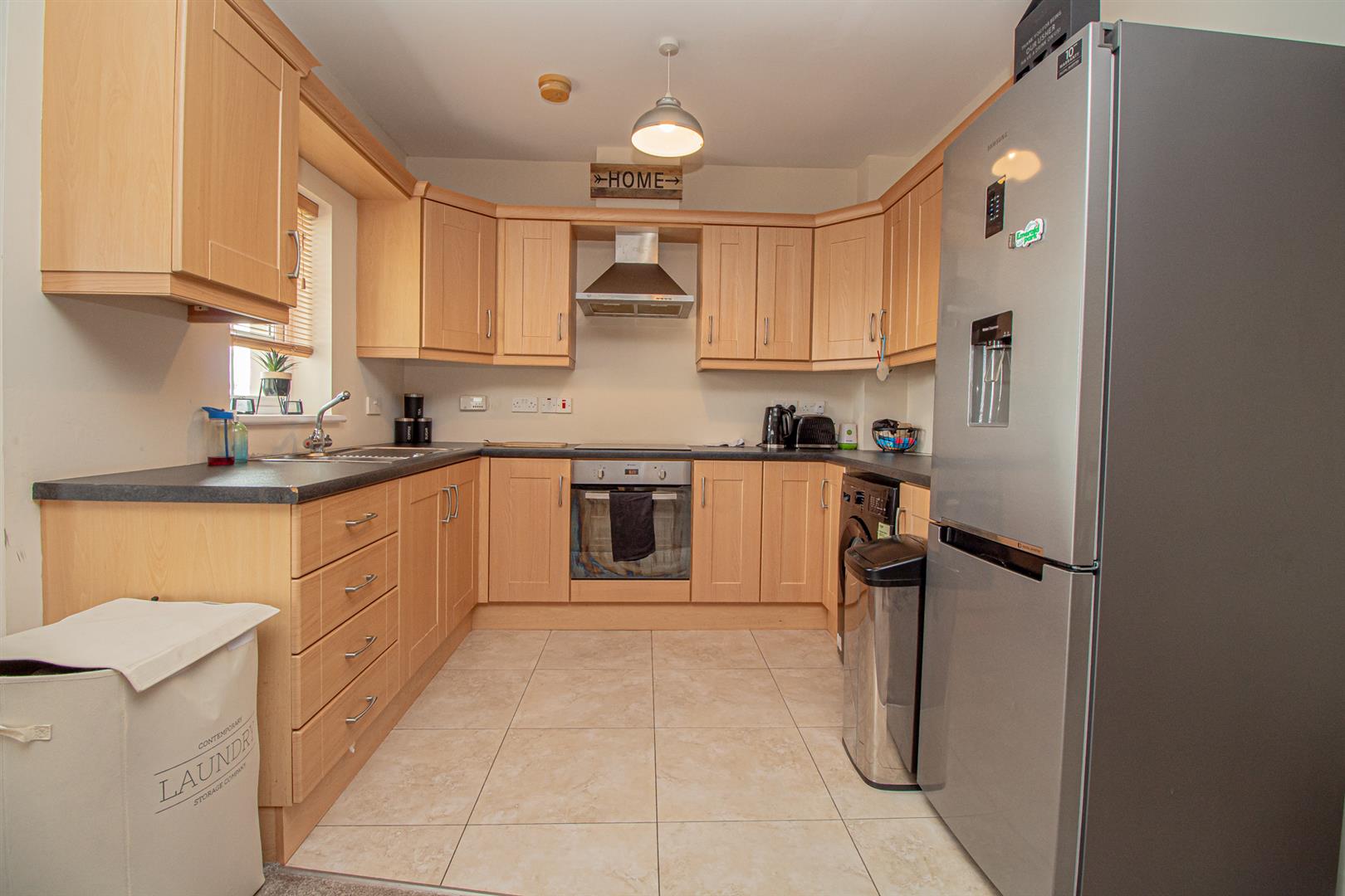 Modern fitted kitchen with high and low level storage units and work surfaces. Stainless steel sink. Space for washing machine and fridge freezer. Integrated 4 ring hob and oven with stainless steel extractor fan over. Tiled floor to kitchen area.