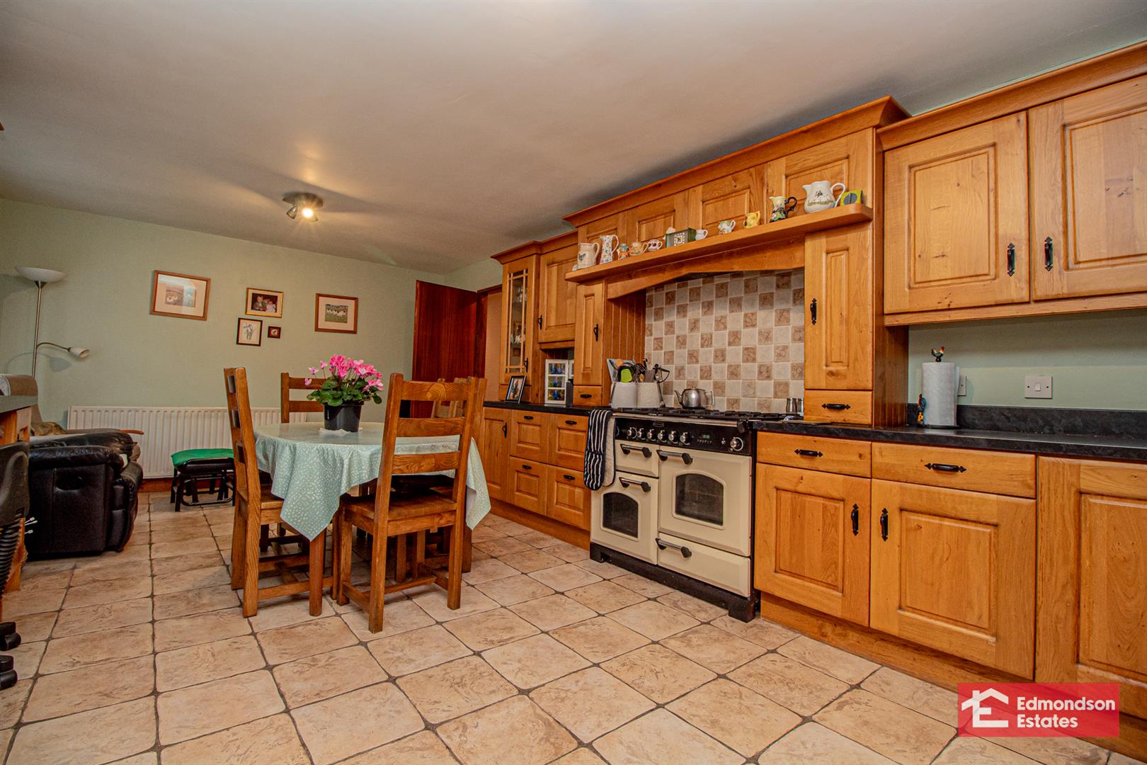 Quality solid wood kitchen with high and low level storage units and work surfaces. Integrated appliances to include fridge freezer, Bosch dishwasher, Range over with 5 ring gas hob and extractor fan over. Stainless steel 1.5 bowl sink unit. Part tiled walls and tiled floor.