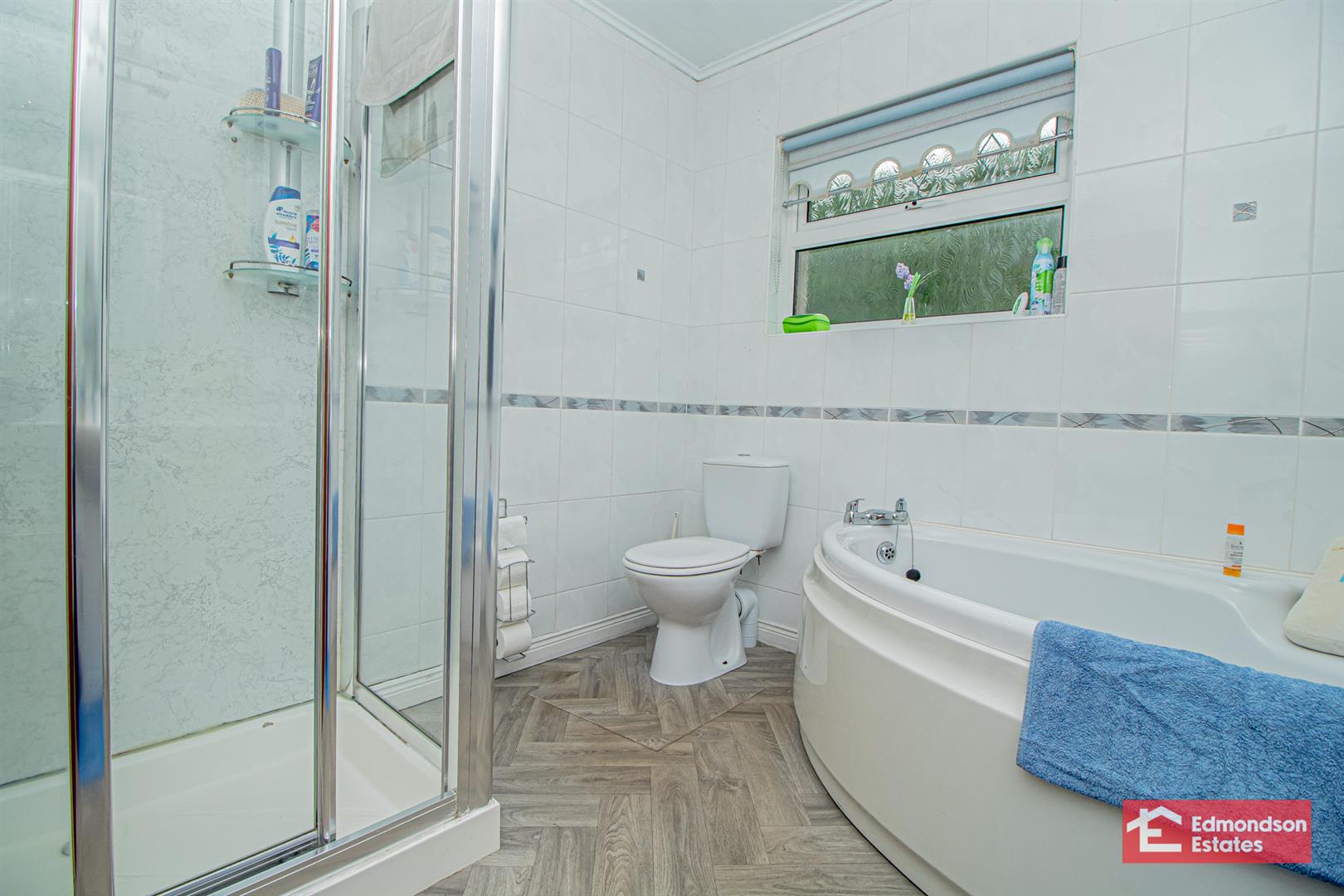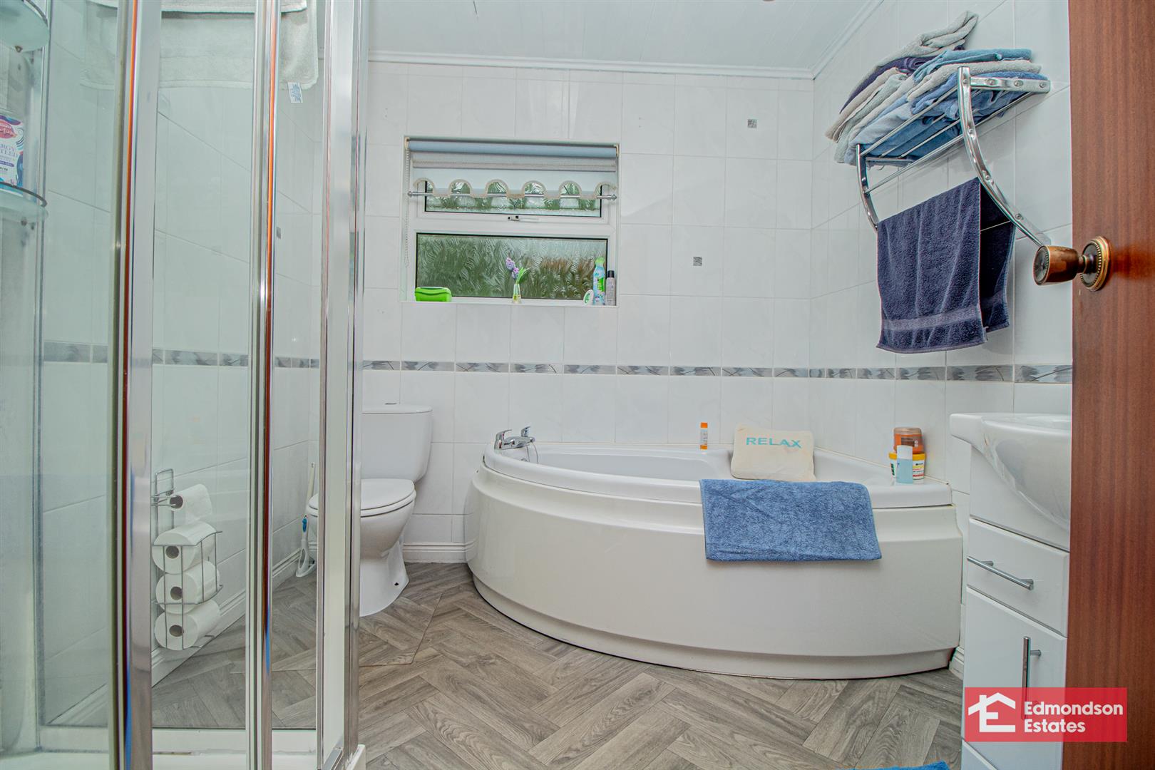 Modern fitted four piece suite comprising corner panelled bath, shower cubicle with electric shower over, vanity unit and WC. Fully tiled walls. Towel rail.