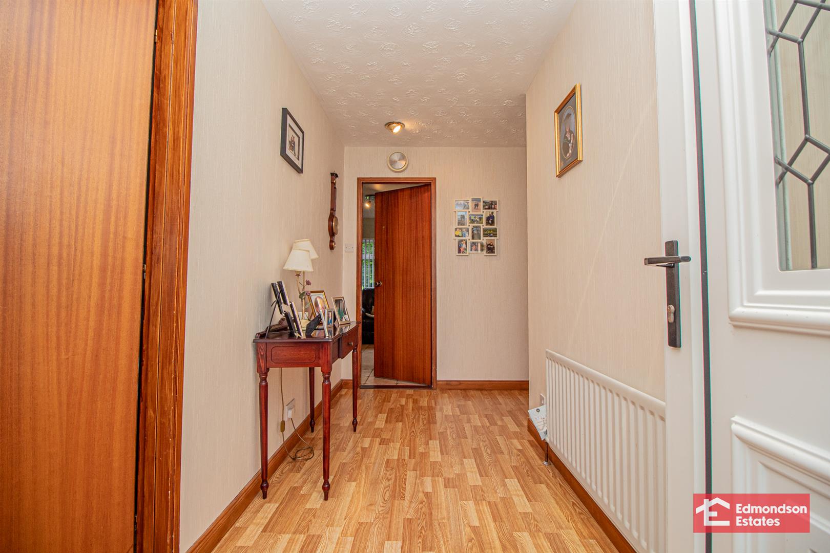 PVC double glazed front door with side screen. Wood laminate floor covering. Access to hot press, store and roof space.